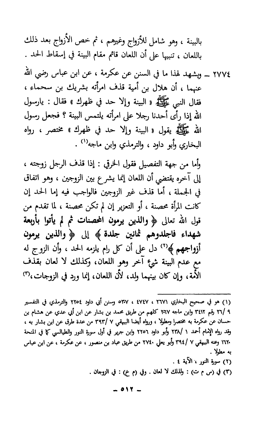 2774 - ويشهد لهذا ما في السنن عن عكرمة، عن ابن عباس - رَضِيَ اللَّهُ عَنْهُمَا -، «أن هلال بن أمية قذف امرأته بشريك بن سحماء، فقال النبي - صَلَّى اللَّهُ عَلَيْهِ وَسَلَّمَ -: «البينة وإلا حد في ظهرك» فقال: يا رسول الله إذا رأى أحدنا رجلا على امرأته يلتمس البينة؟ فجعل رسول الله - صَلَّى اللَّهُ عَلَيْهِ وَسَلَّمَ - يقول: «البينة وإلا حد في ظهرك» مختصر، رواه البخاري وأبو داود، والترمذي وابن ماجه.