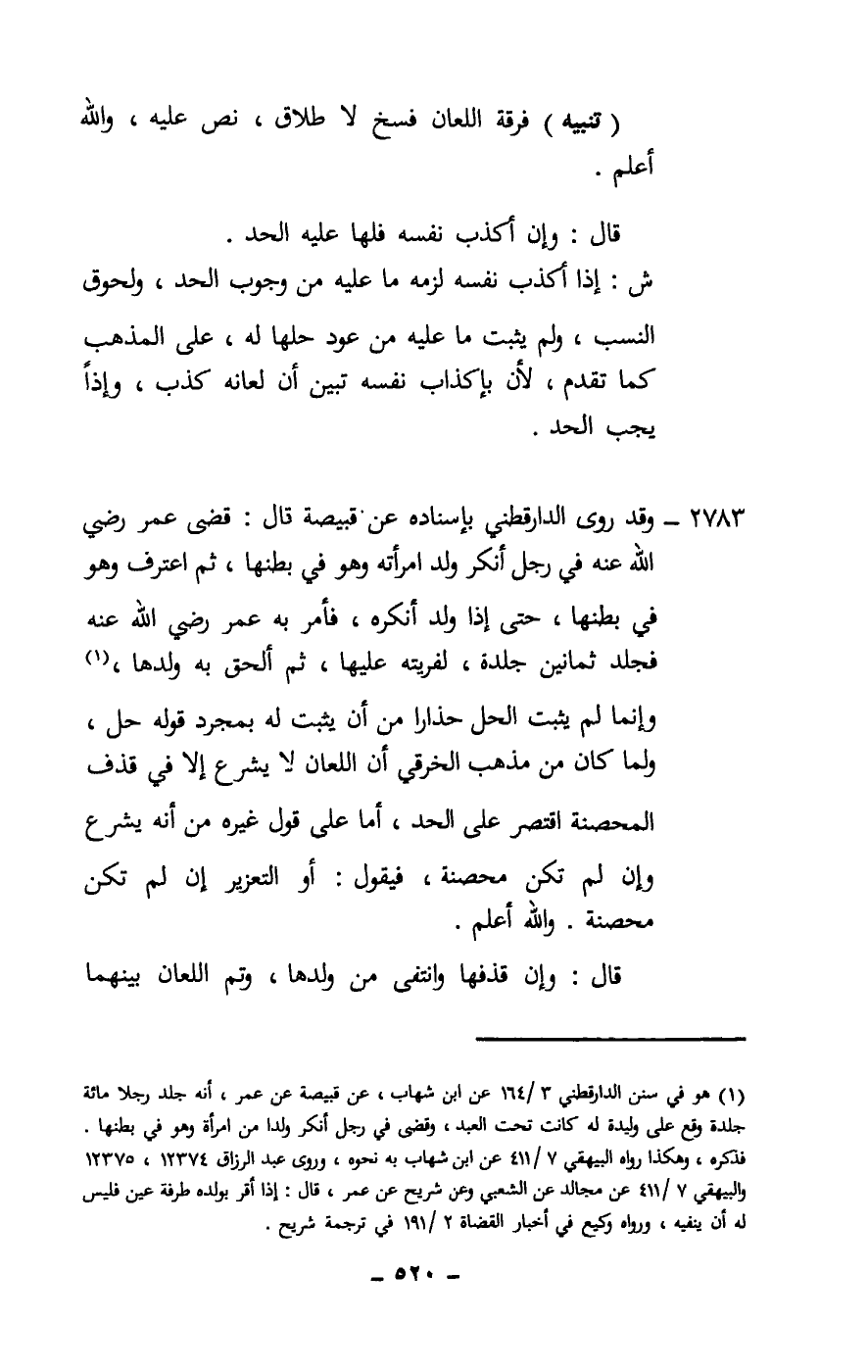 2783 - وقد روى الدارقطني بإسناده عن قبيصة قال: قضى عمر - رَضِيَ اللَّهُ عَنْهُ - في رجل أنكر ولد امرأته وهو في بطنها، ثم اعترف وهو في بطنها، حتى إذا ولد أنكره، فأمر به عمر - رَضِيَ اللَّهُ عَنْهُ - فجلد ثمانين جلدة، لفريته عليها، ثم ألحق به ولدها، وإنما لم يثبت الحل حذارا من أن يثبت له بمجرد قوله حل، ولما كان من مذهب الخرقي أن اللعان لا يشرع إلا في قذف المحصنة اقتصر على الحد، أما على قول غيره من أنه يشرع وإن لم تكن محصنة، فيقول: أو التعزير إن لم تكن محصنة. والله أعلم.