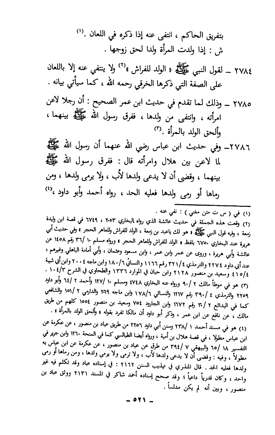 2785 - وذلك لما تقدم في حديث ابن عمر الصحيح: «أن رجلا لاعن امرأته، وانتفى من ولدها، ففرق رسول الله - صَلَّى اللَّهُ عَلَيْهِ وَسَلَّمَ - بينهما، وألحق الولد بالمرأة» .
