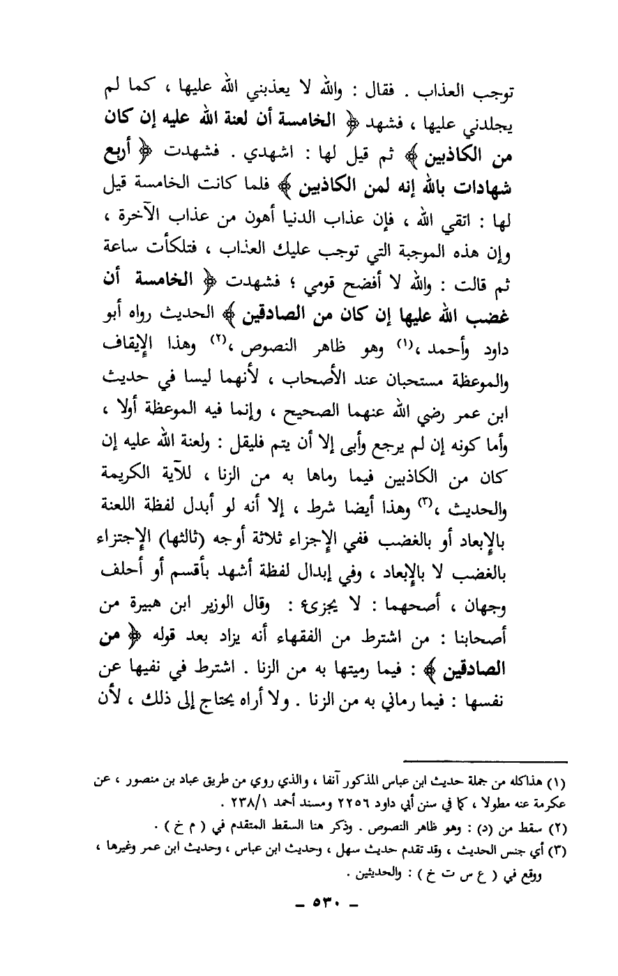 توجب العذاب. فقال: والله لا يعذبني الله عليها، كما لم يجلدني عليها، فشهد: {وَالْخَامِسَةُ أَنَّ لَعْنَةَ اللَّهِ عَلَيْهِ إِنْ كَانَ مِنَ الْكَاذِبِينَ} [النور: 7] ثم قيل لها: اشهدي. فشهدت: {أَرْبَعَ شَهَادَاتٍ بِاللَّهِ إِنَّهُ لَمِنَ الْكَاذِبِينَ} [النور: 8] فلما كانت الخامسة قيل لها: اتقي الله، فإن عذاب الدنيا أهون من عذاب الآخرة، وإن هذه الموجبة التي توجب عليك العذاب، فتلكأت ساعة ثم قالت: والله لا أفضح قومي، فشهدت: {وَالْخَامِسَةَ أَنَّ غَضَبَ اللَّهِ عَلَيْهَا إِنْ كَانَ مِنَ الصَّادِقِينَ} [النور: 9] » الحديث رواه أبو داود وأحمد، وهو ظاهر النصوص، وهذا الإيقاف والموعظة مستحبان عند الأصحاب، لأنهما ليسا في حديث ابن عمر - رَضِيَ اللَّهُ عَنْهُمَا - الصحيح، وإنما فيه الموعظة أولا، وأما كونه إن لم يرجع وأبى إلا أن يتم فليقل: ولعنة الله عليه إن كان من الكاذبين فيما رماها به من الزنا، للآية الكريمة والحديث، وهذا أيضا شرط، إلا أنه لو أبدل لفظة اللعنة بالإبعاد أو بالغضب ففي الإجزاء ثلاثة أوجه (ثالثها) الاجتزاء بالغضب لا بالإبعاد، وفي إبدال لفظه أشهد بأقسم أو أحلف وجهان، أصحهما: لا يجزئ: وقال الوزير ابن هبيرة من أصحابنا: من اشترط من الفقهاء أنه يزاد بعد قوله: {مِنَ الصَّادِقِينَ} [النور: 9] : فيما رميتها به من الزنا. اشترط في نفيها عن نفسها: فيما رماني به من الزنا. ولا أراه يحتاج إلى ذلك، لأن