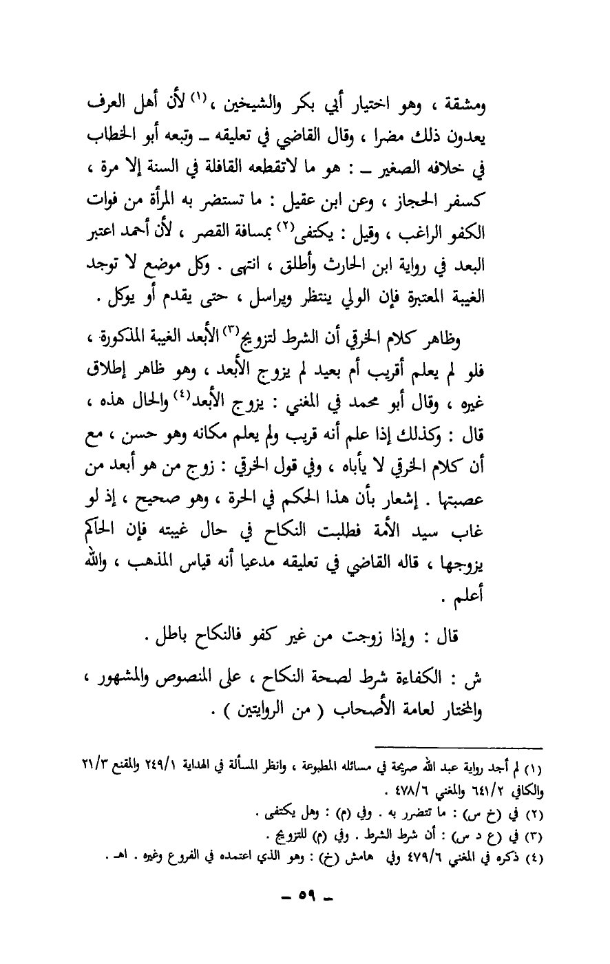 ومشقة، وهو اختيار أبي بكر , والشيخين، لأن أهل العرف يعدون ذلك مضرا، وقال القاضي في تعليقه - وتبعه أبو الخطاب في خلافه الصغير -: هو ما لا تقطعه القافلة في السنة إلا مرة، كسفر الحجاز، وعن ابن عقيل: ما تستضر به المرأة من فوات الكفو الراغب، وقيل: يكتفى بمسافة القصر، لأن أحمد اعتبر البعد في رواية ابن الحارث وأطلق، انتهى.