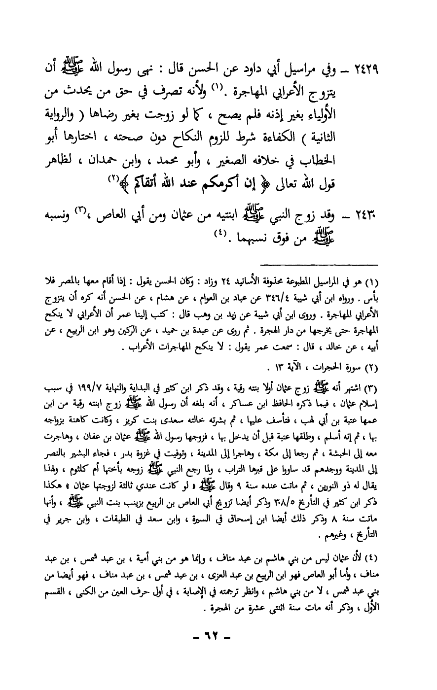 2430 - وقد «زوج النبي - صَلَّى اللَّهُ عَلَيْهِ وَسَلَّمَ - ابنتيه من عثمان ومن أبي العاص» ، ونسبه - صَلَّى اللَّهُ عَلَيْهِ وَسَلَّمَ - من فوق نسبهما.