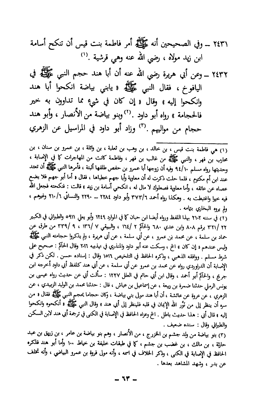 2431 - وفي الصحيحين «أنه - صَلَّى اللَّهُ عَلَيْهِ وَسَلَّمَ - أمر فاطمة بنت قيس أن تنكح أسامة بن زيد مولاه - رَضِيَ اللَّهُ عَنْهُ - وهي قرشية» .