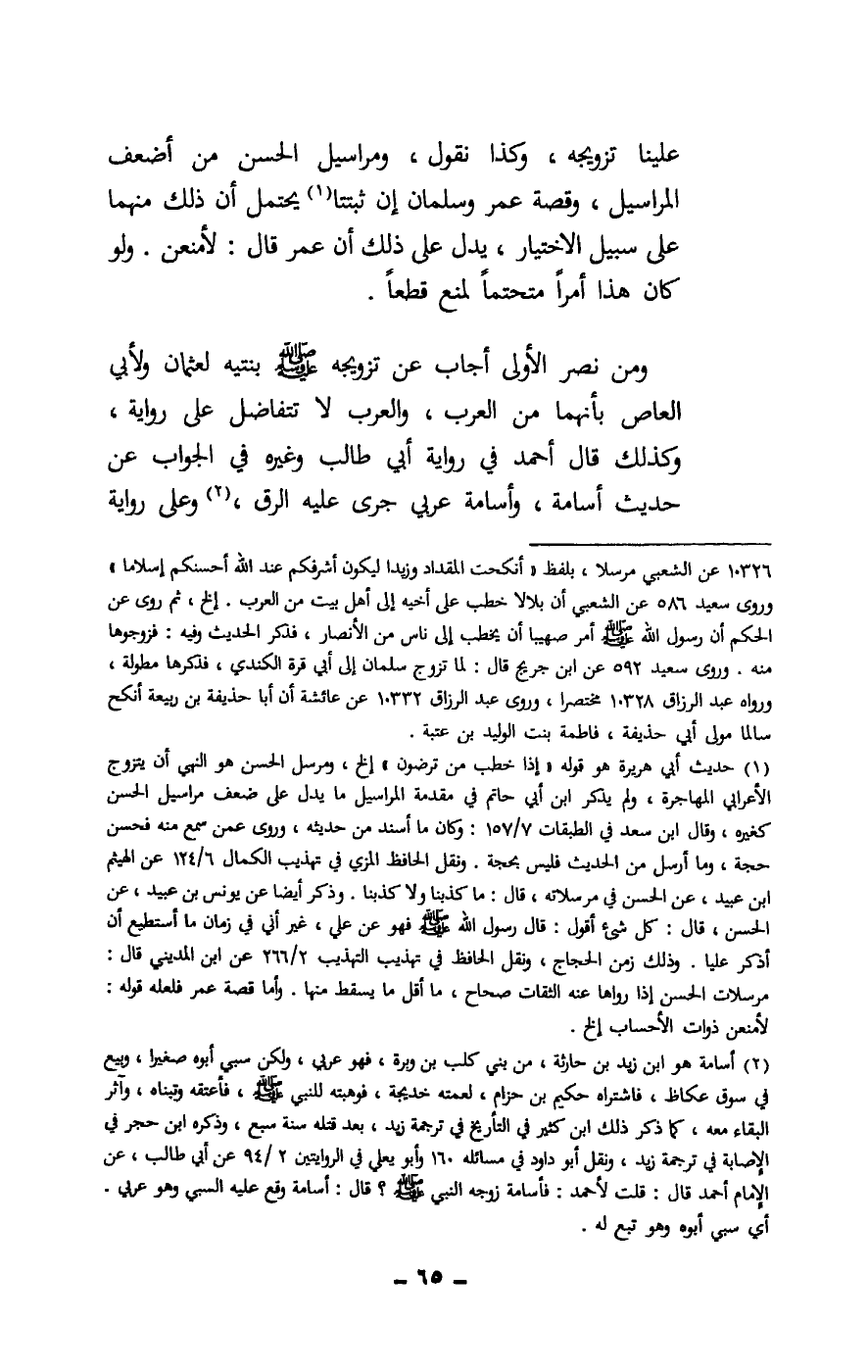 ومن نصر الأولى أجاب عن تزويجه - صَلَّى اللَّهُ عَلَيْهِ وَسَلَّمَ - بنتيه لعثمان ولأبي العاص بأنهما من العرب، والعرب لا تتفاضل على رواية، وكذلك قال أحمد في رواية أبي طالب وغيره في الجواب عن حديث أسامة، وأسامة عربي جرى عليه الرق، وعلى رواية