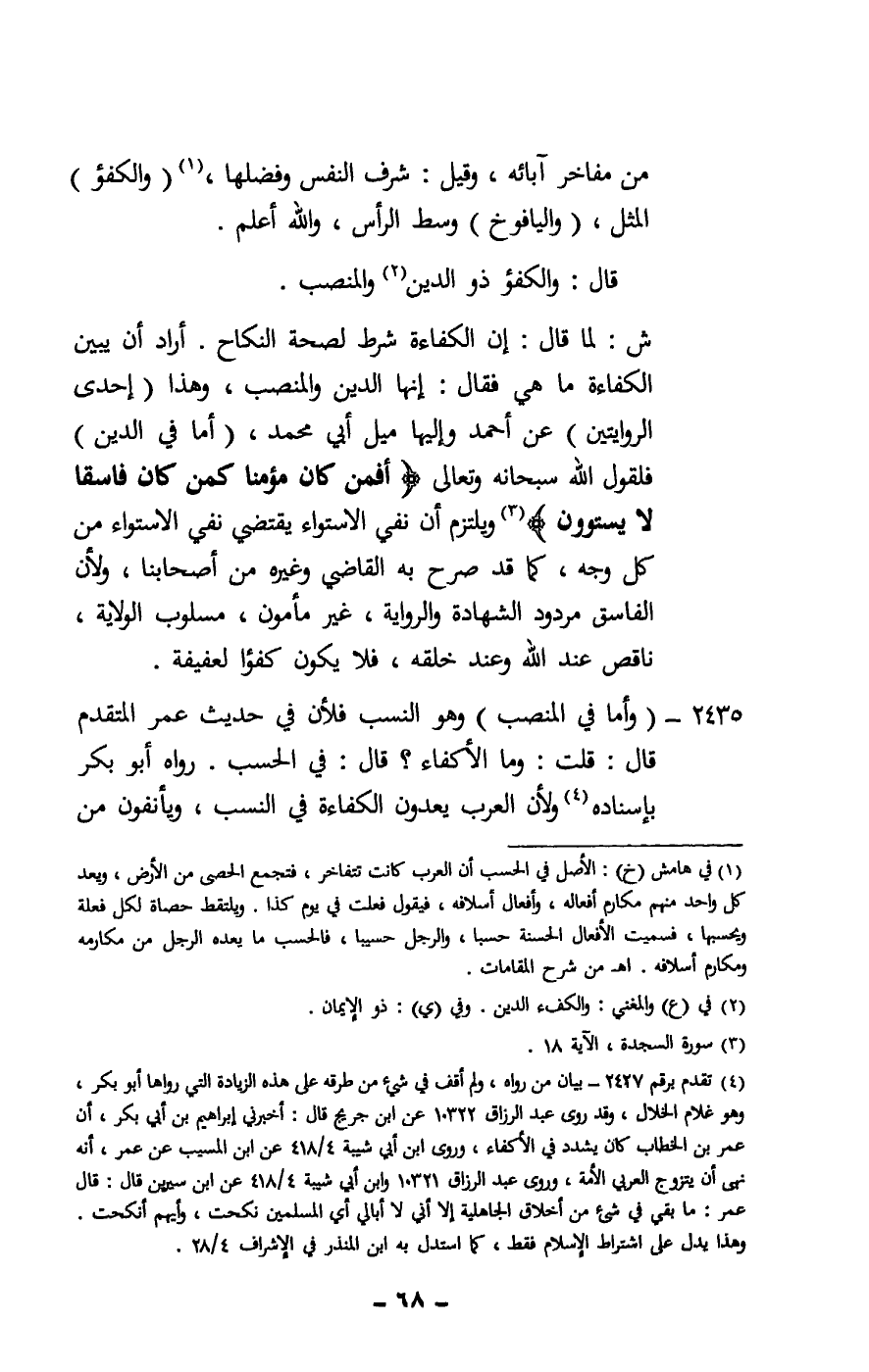 2435 - (وأما في المنصب) وهو النسب فلأن في حديث عمر المتقدم، قال: قلت: وما الأكفاء؟ قال: في الحسب. رواه أبو بكر بإسناده، ولأن العرب يعدون الكفاءة في النسب، ويأنفون من