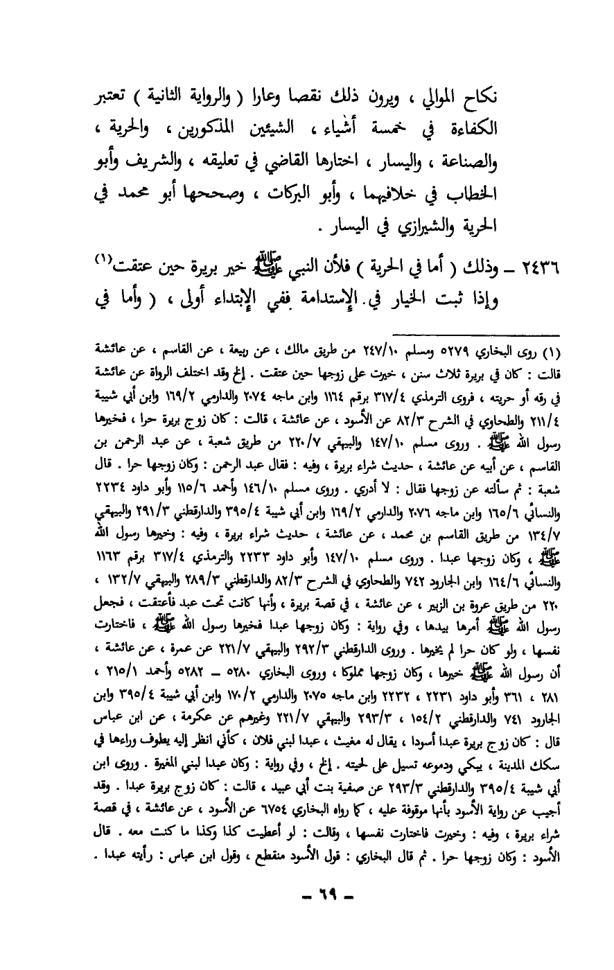 2436 - وذلك (أما في الحرية) فلأن النبي - صَلَّى اللَّهُ عَلَيْهِ وَسَلَّمَ - خير بريرة حين عتقت، وإذا ثبت الخيار في الاستدامة ففي الابتداء أولى، (وأما في
