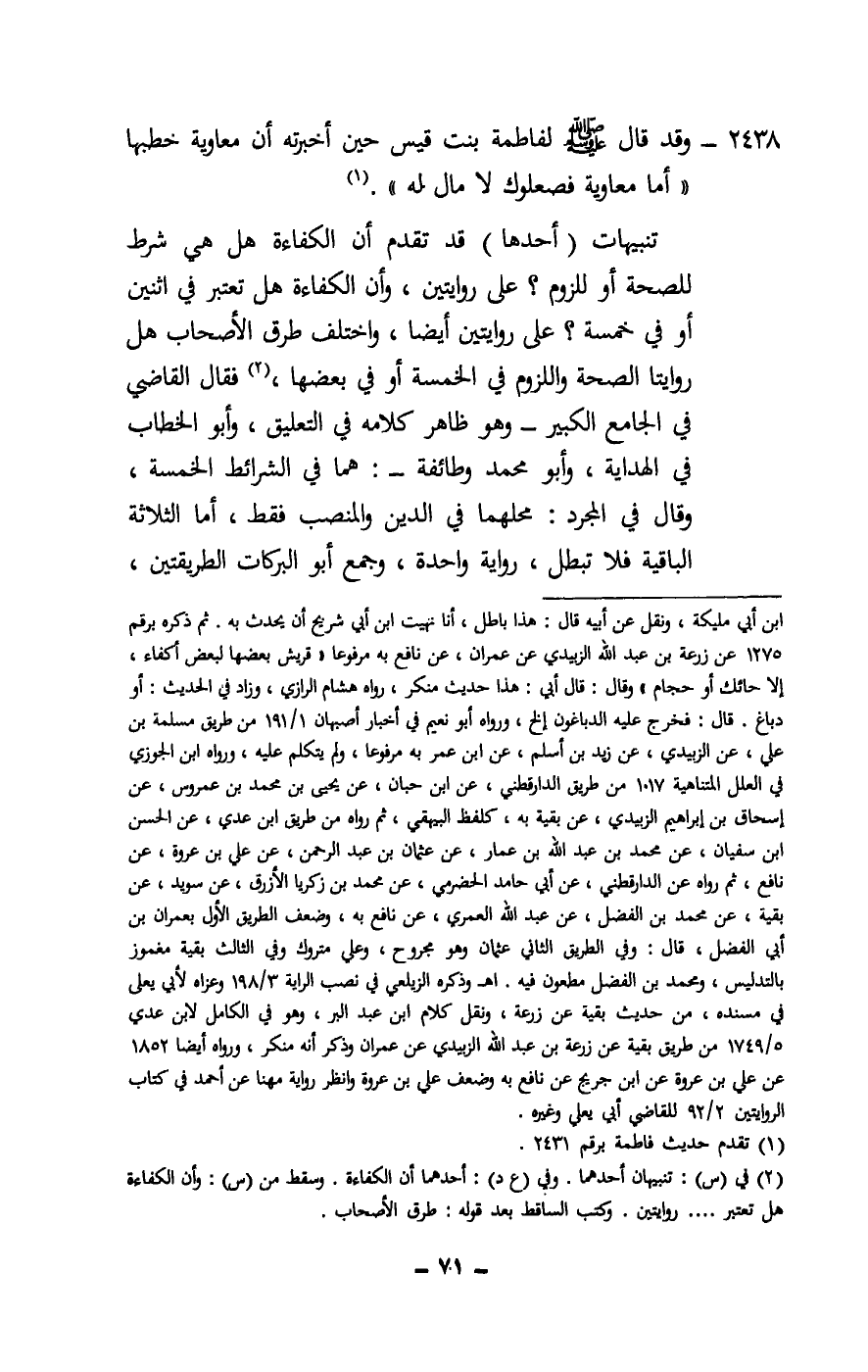 2438 - وقد قال - صَلَّى اللَّهُ عَلَيْهِ وَسَلَّمَ - لفاطمة بنت قيس حين أخبرته أن معاوية خطبها «أما معاوية فصعلوك لا مال له» .