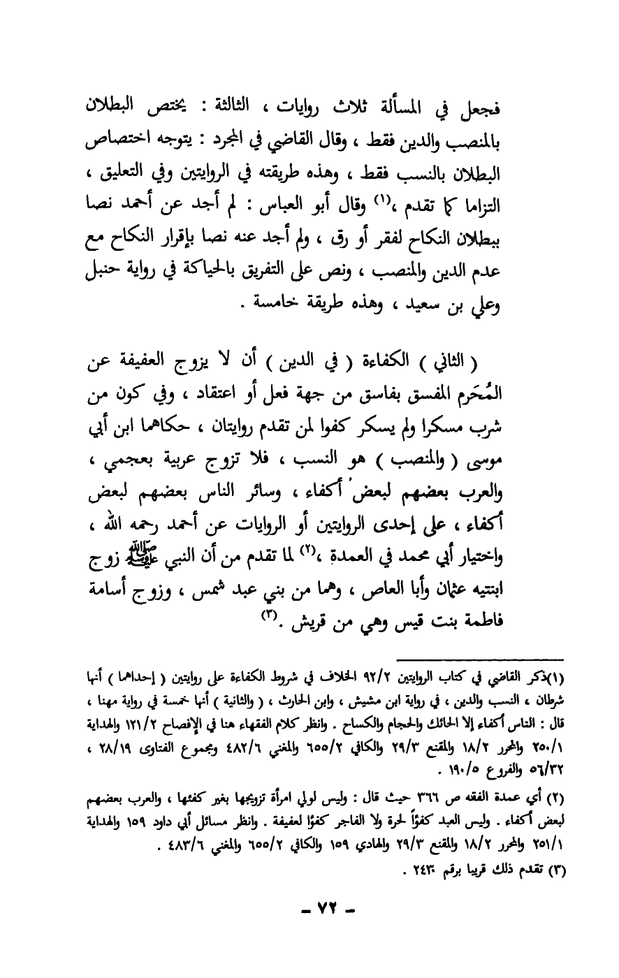 (الثاني) : الكفاءة في الدين) أن لا يزوج العفيفة عن المحرم المفسق بفاسق من جهة فعل أو اعتقاد، وفي كون من شرب مسكرا ولم يسكر كفوا لمن تقدم روايتان، حكاهما ابن أبي موسى (والمنصب) هو النسب، فلا تزوج عربية بعجمي، والعرب بعضهم لبعض أكفاء، وسائر الناس بعضهم لبعض أكفاء، على إحدى الروايتين أو الروايات عن أحمد - رحمة الله -، واختيار أبي محمد في العمدة، لما تقدم من أن «النبي - صَلَّى اللَّهُ عَلَيْهِ وَسَلَّمَ - زوج ابنتيه عثمان وأبا العاص، وهما من بني عبد شمس، وزوج أسامة فاطمة بنت قيس وهي من قريش» .