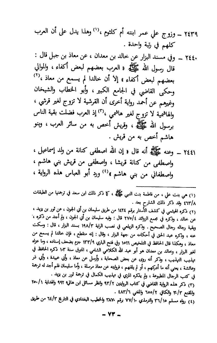 2439 - وزوج علي عمر ابنته أم كلثوم، وهذا يدل على أن العرب كلهم في رتبة واحدة.