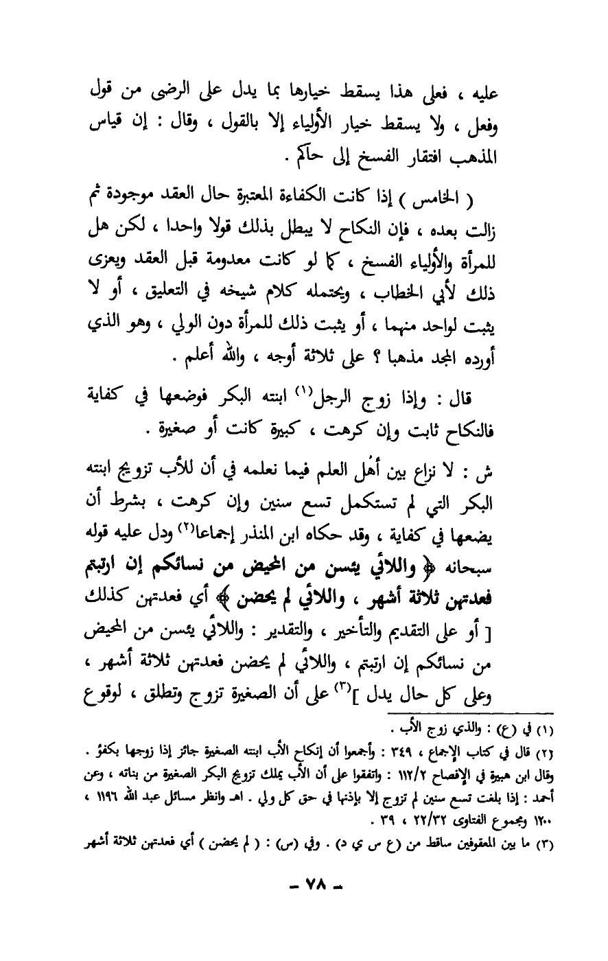 ش: لا نزاع بين أهل العلم فيما نعلمه في أن للأب تزويج ابنته البكر التي لم تستكمل تسع سنين وإن كرهت، بشرط أن يضعها في كفاية، وقد حكاه ابن المنذر إجماعا، ودل عليه قوله سبحانه: {وَاللَّائِي يَئِسْنَ مِنَ الْمَحِيضِ مِنْ نِسَائِكُمْ إِنِ ارْتَبْتُمْ فَعِدَّتُهُنَّ ثَلَاثَةُ أَشْهُرٍ وَاللَّائِي لَمْ يَحِضْنَ} [الطلاق: 4] أي فعدتهن كذلك [أو على التقديم والتأخير، والتقدير: واللائي يئسن من المحيض من نسائكم إن ارتبتم، واللائي لم يحضن فعدتهن ثلاثة أشهر، وعلى كل حال يدل] على أن الصغيرة تزوج وتطلق، لوقوع