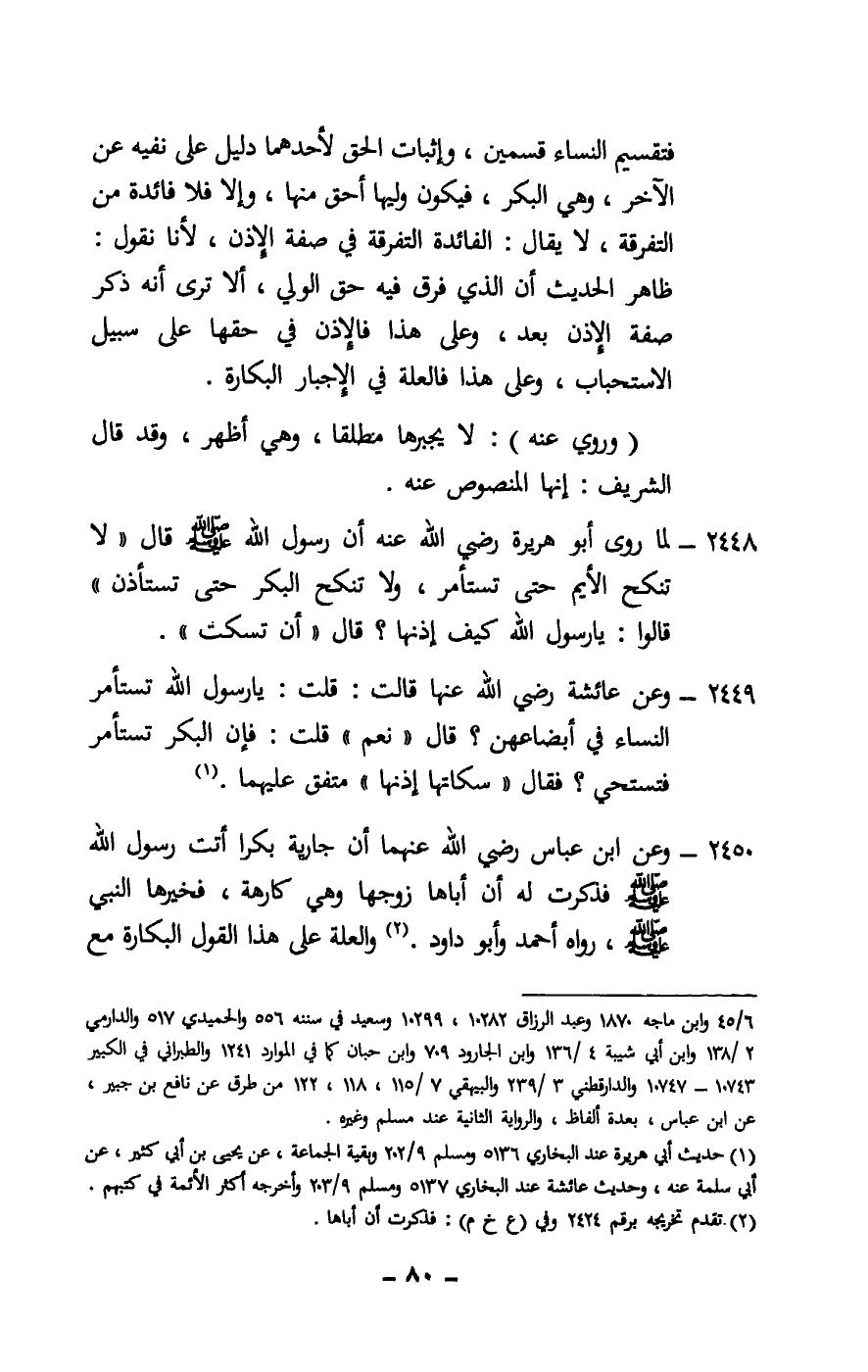 2448 - لما روى أبو هريرة - رَضِيَ اللَّهُ عَنْهُ - أن رسول الله - صَلَّى اللَّهُ عَلَيْهِ وَسَلَّمَ - قال: «لا تنكح الأيم حتى تستأمر، ولا تنكح البكر حتى تستأذن» قالوا: يا رسول الله، كيف إذنها؟ قال: «أن تسكت» .