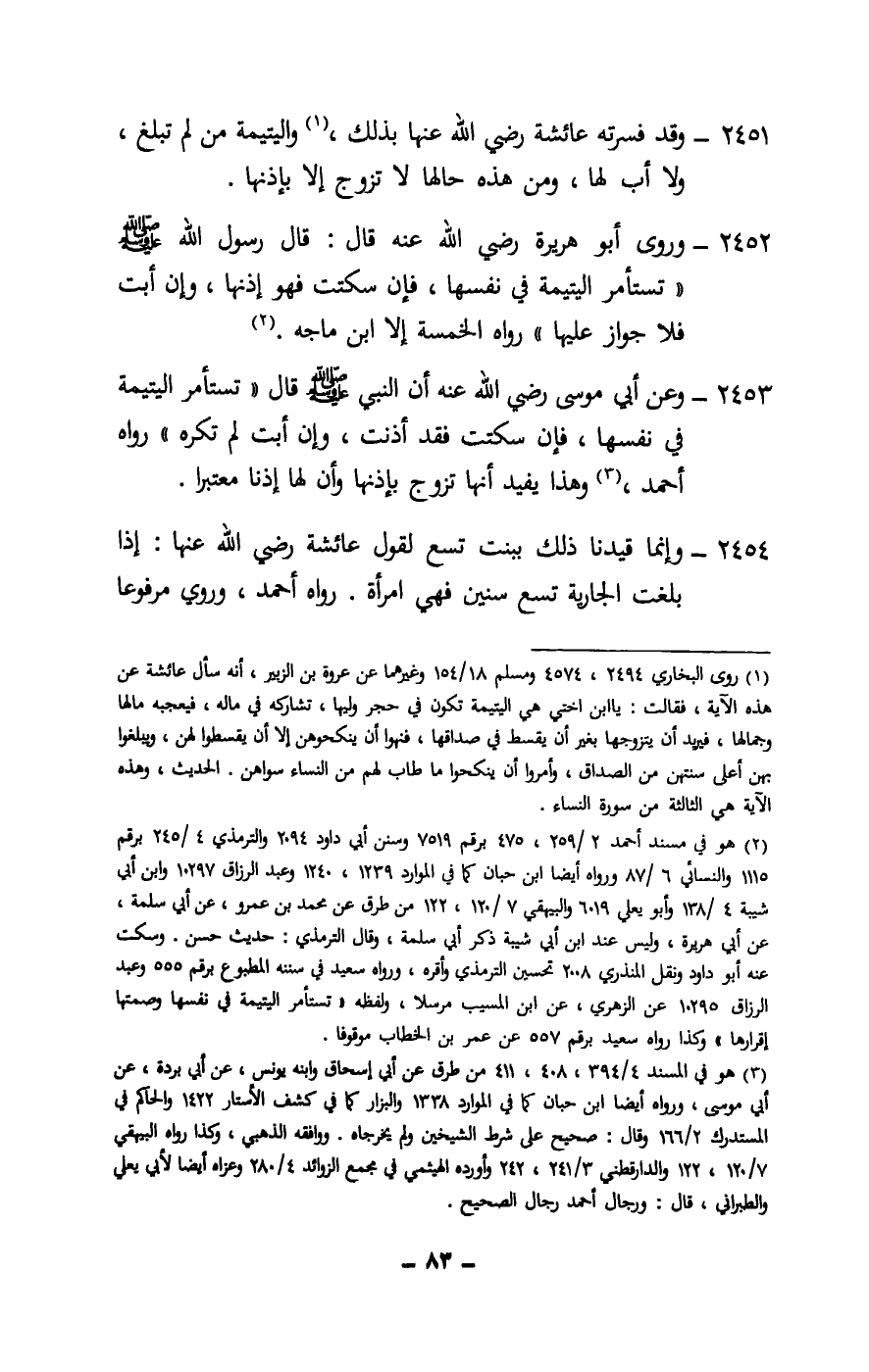 2452 - وروى أبو هريرة - رَضِيَ اللَّهُ عَنْهُ - قال: قال رسول الله - صَلَّى اللَّهُ عَلَيْهِ وَسَلَّمَ -: «تستأمر اليتيمة في نفسها، فإن سكتت فهو إذنها، وإن أبت فلا جواز عليها» رواه الخمسة إلا ابن ماجه.