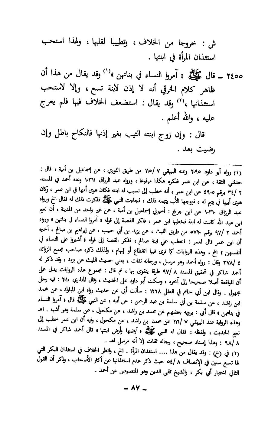 2455 - قال - صَلَّى اللَّهُ عَلَيْهِ وَسَلَّمَ -: «آمروا النساء في بناتهن» وقد يقال من هذا أن ظاهر كلام الخرقي أنه لا إذن لابنة تسع، وإلا لاستحب استئذانها، وقد يقال: استضعف الخلاف فيها فلم يعرج عليه، والله أعلم.