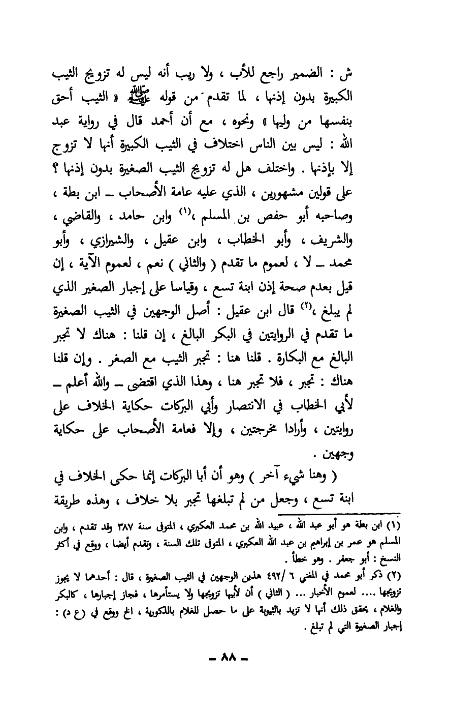 ش: الضمير راجع للأب، ولا ريب أنه ليس له تزويج الثيب الكبيرة بدون إذنها، لما تقدم من قوله: - صَلَّى اللَّهُ عَلَيْهِ وَسَلَّمَ - «الثيب أحق بنفسها من وليها» ونحوه، مع أن أحمد قال في رواية عبد الله: ليس بين الناس اختلاف في الثيب الكبيرة أنها لا تزوج إلا بإذنها. واختلف هل له تزويج الثيب الصغيرة بدون إذنها؟ على قولين مشهورين، الذي عليه عامة الأصحاب - ابن بطة، وصاحبه أبو حفص بن مسلم , وابن حامد , والقاضي , والشريف , وأبو الخطاب، وابن عقيل، والشيرازي، وأبو محمد - لا، لعموم ما تقدم، (والثاني) نعم، لعموم الآية، إن قيل بعدم صحة إذن ابنة تسع، وقياسا على إجبار الصغير الذي لم يبلغ، قال ابن عقيل: أصل الوجهين في الثيب الصغيرة ما تقدم في الروايتين في البكر البالغ، إن قلنا: هناك لا تجبر البالغ مع البكارة. قلنا هنا: تجبر الثيب مع الصغر. وإن قلنا هناك: تجبر , فلا تجبر هنا، وهذا الذي اقتضى - والله أعلم - لأبي الخطاب في الانتصار , وأبي البركات حكاية الخلاف على روايتين، وأرادا مخرجتين، وإلا فعامة الأصحاب على حكاية وجهين.