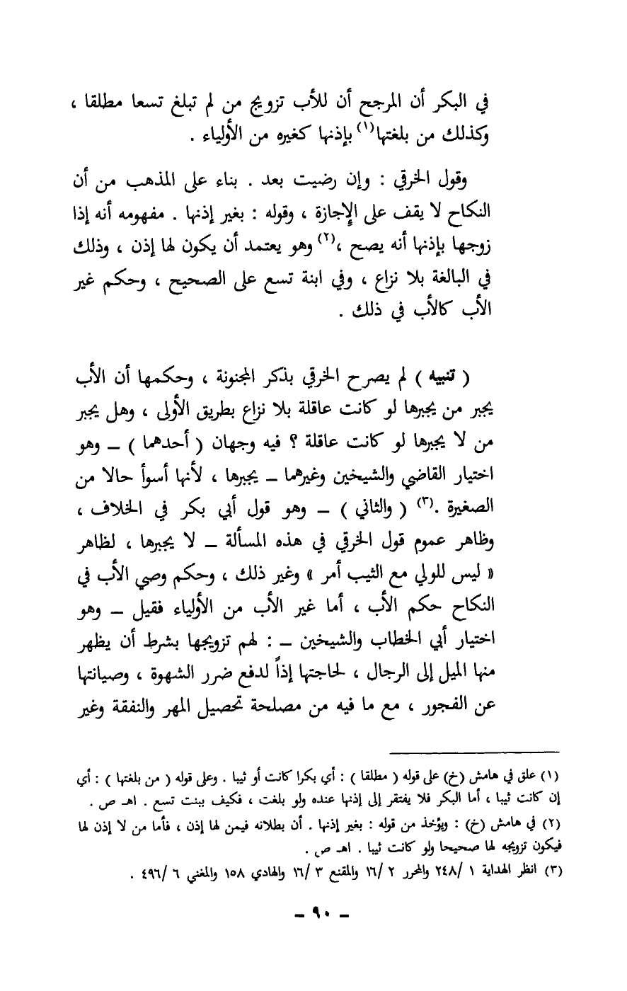 (تنبيه) لم يصرح الخرقي بذكر المجنونة، وحكمها أن الأب يجبرها لو كانت عاقلة بلا نزاع بطريق الأولى، وهل يجبر من لا يجبرها لو كانت عاقلة؟ فيه وجهان: (أحدهما) : - وهو اختيار القاضي والشيخين وغيرهما - يجبرها، لأنها أسوأ حالا من الصغيرة.