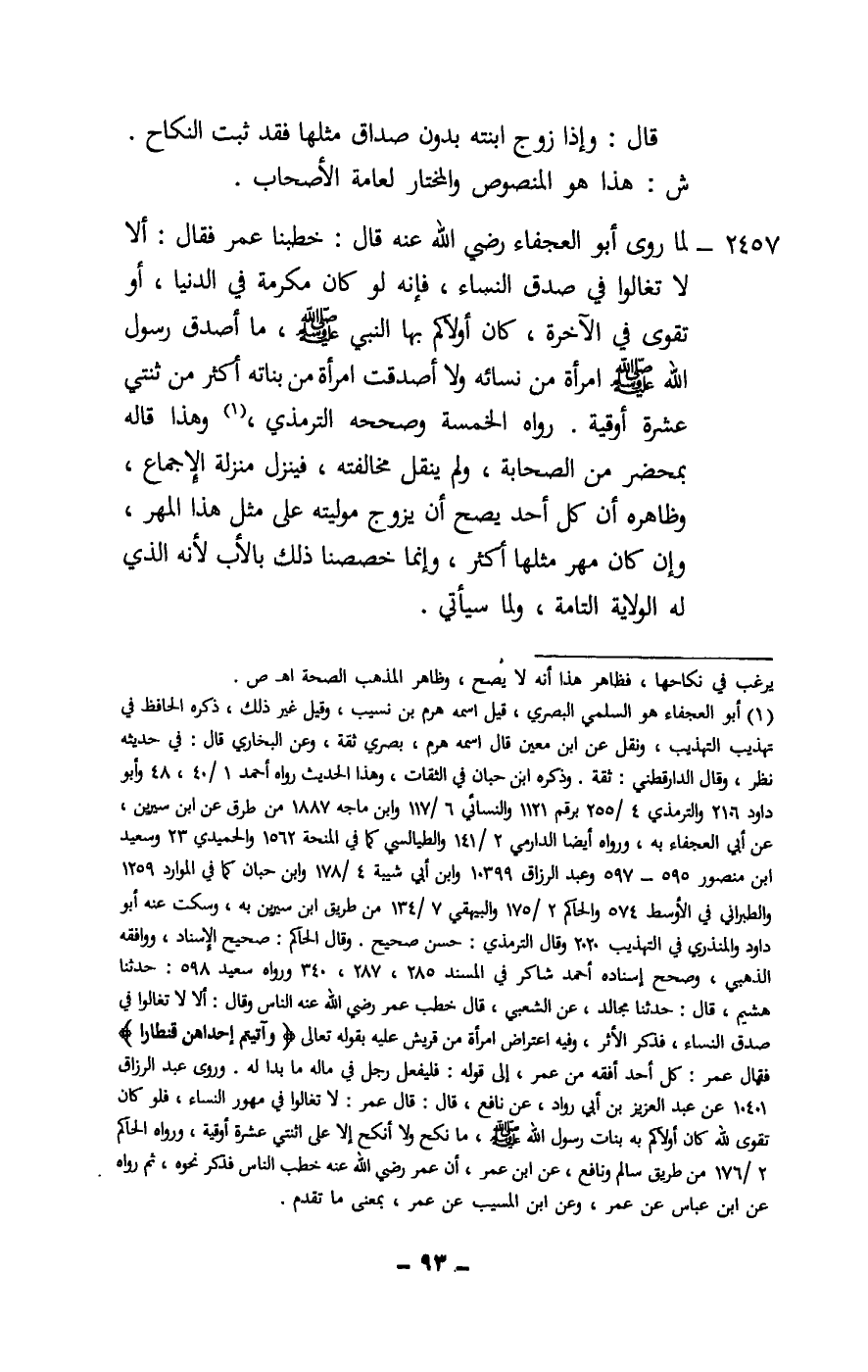 2457 - لما روى أبو العجفاء - رَضِيَ اللَّهُ عَنْهُ - قال: خطبنا عمر، فقال: ألا لا تغالوا في صدق النساء، فإنه لو كان مكرمة في الدنيا، أو تقوى في الآخرة، كان أولاكم بها النبي - صَلَّى اللَّهُ عَلَيْهِ وَسَلَّمَ - ما أصدق رسول الله - صَلَّى اللَّهُ عَلَيْهِ وَسَلَّمَ - امرأة من نسائه ولا أصدقت امرأة من بناته أكثر من ثنتي عشرة أوقية. رواه الخمسة، وصححه الترمذي، وهذا قاله بمحضر من الصحابة، ولم ينقل مخالفته، فينزل منزلة الإجماع، وظاهره أن كل أحد يصح أن يزوج موليته على مثل هذا المهر، وإن كان مهر مثلها أكثر، وإنما خصصنا ذلك بالأب لأنه الذي له الولاية التامة، ولما سيأتي.