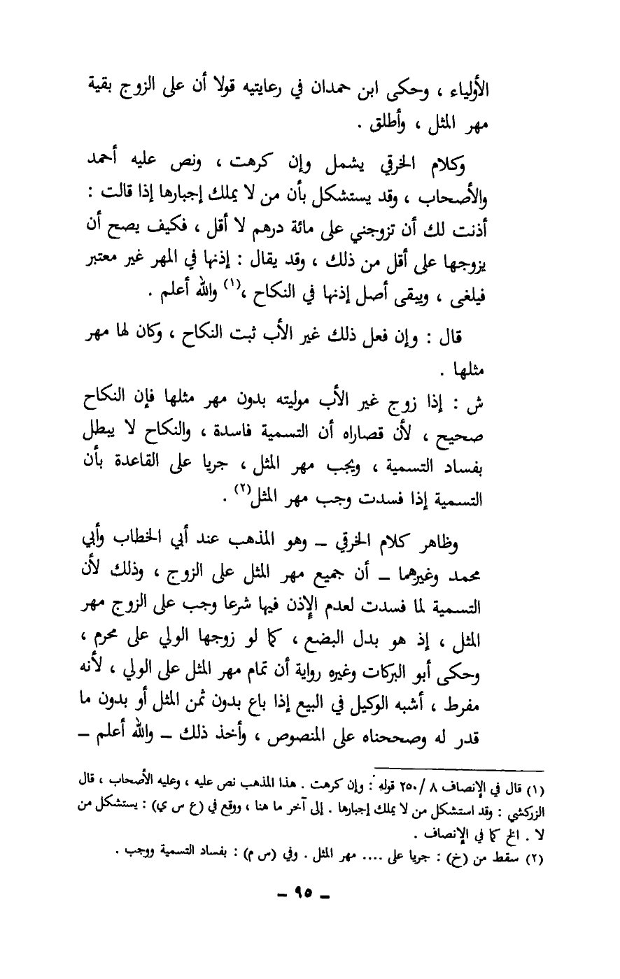 وظاهر كلام الخرقي - وهو المذهب عند أبي الخطاب وأبي محمد وغيرهما - أن جميع مهر المثل على الزوج، وذلك لأن التسمية لما فسدت لعدم الإذن فيها شرعا وجب على الزوج مهر المثل، إذ هو بدل البضع، كما لو زوجها الولي على محرم، وحكى أبو البركات وغيره رواية، أن تمام مهر المثل على الولي، لأنه مفرط، أشبه الوكيل في البيع إذا باع بدون ثمن المثل أو بدون ما قدر له وصححناه على المنصوص، وأخذ ذلك - والله أعلم -