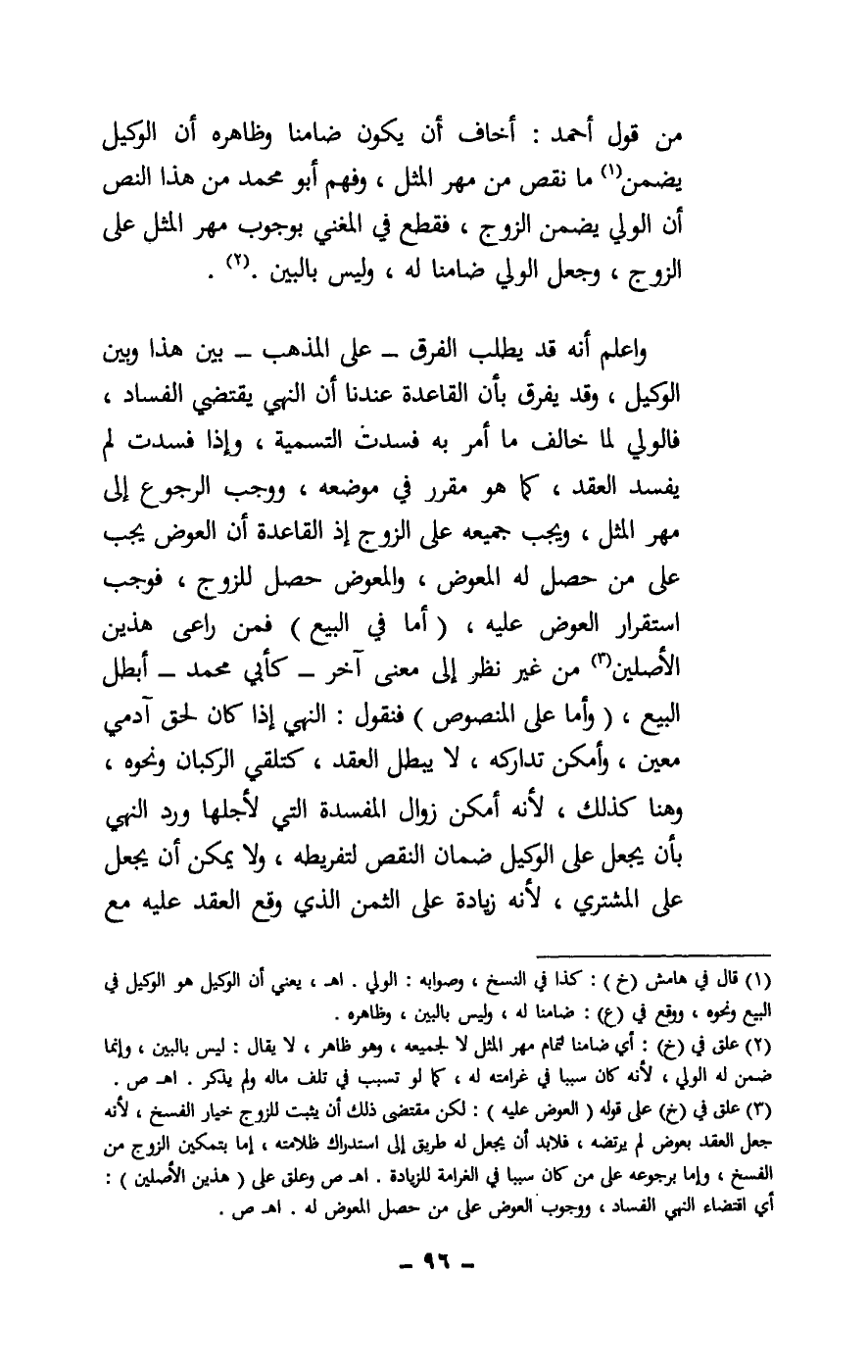 من قول أحمد: أخاف أن يكون ضامنا، وظاهره أن الوكيل يضمن ما نقص من مهر المثل، وفهم أبو محمد من هذا النص أن الولي يضمن الزوج، فقطع في المغني بوجوب مهر المثل على الزوج، وجعل الولي ضامنا له، وليس بالبين.