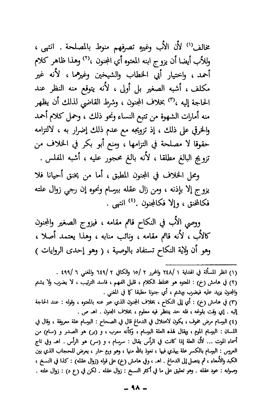 وللأب أيضا أن يزوج ابنه المعتوه، أي المجنون، وهذا ظاهر كلام أحمد، واختيار أبي الخطاب والشيخين وغيرهما، لأنه غير مكلف، أشبه الصغير بل أولى، لأنه يتوقع منه النظر عند الحاجة إليه، بخلاف المجنون، وشرط القاضي لذلك أن يظهر منه أمارات الشهوة من تتبع النساء ونحو ذلك، وحمل كلام أحمد، والخرقي على ذلك، إذ تزويجه مع عدم ذلك إضرار به، لالتزامه حقوقا لا مصلحة في التزامها، ومنع أبو بكر في الخلاف من تزويج البالغ مطلقا، لأنه بالغ محجور عليه، أشبه المفلس.