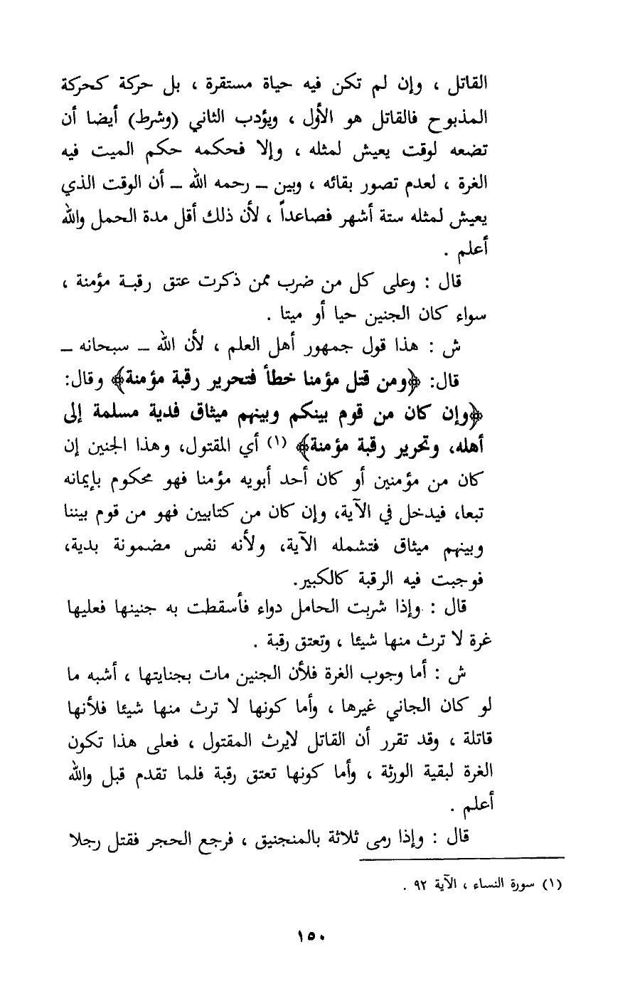 ش: هذا قول جمهور أهل العلم، لأن الله سبحانه قال: {وَمَنْ قَتَلَ مُؤْمِنًا خَطَأً فَتَحْرِيرُ رَقَبَةٍ مُؤْمِنَةٍ} [النساء: 92] وقال: {وَإِنْ كَانَ مِنْ قَوْمٍ بَيْنَكُمْ وَبَيْنَهُمْ مِيثَاقٌ فَدِيَةٌ مُسَلَّمَةٌ إِلَى أَهْلِهِ وَتَحْرِيرُ رَقَبَةٍ مُؤْمِنَةٍ} [النساء: 92] أي المقتول، وهذا الجنين إن كان من مؤمنين أو كان أحد أبويه مؤمنا فهو محكوم بإيمانه تبعا، فيدخل في الآية، وإن كان من كتابيين فهو من قوم بيننا وبينهم ميثاق فتشمله الآية، ولأنه نفس مضمونة بدية، فوجبت فيه الرقبة كالكبير.