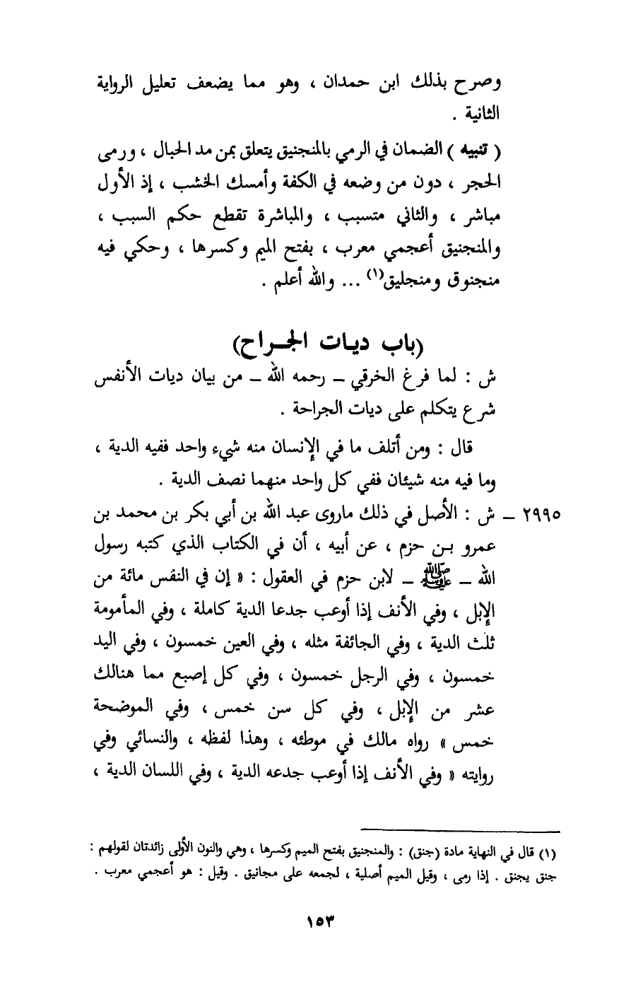 (تنبيه) : الضمان في الرمي بالمنجنيق يتعلق بمن مد الحبال، ورمى الحجر، دون من وضعه في الكفة وأمسك الخشب، إذ الأول مباشر، والثاني متسبب، والمباشرة تقطع حكم السبب، والمنجنيق أعجمي معرب، بفتح الميم وكسرها، وحكي فيه منجنوق ومنجليق. . . والله أعلم.