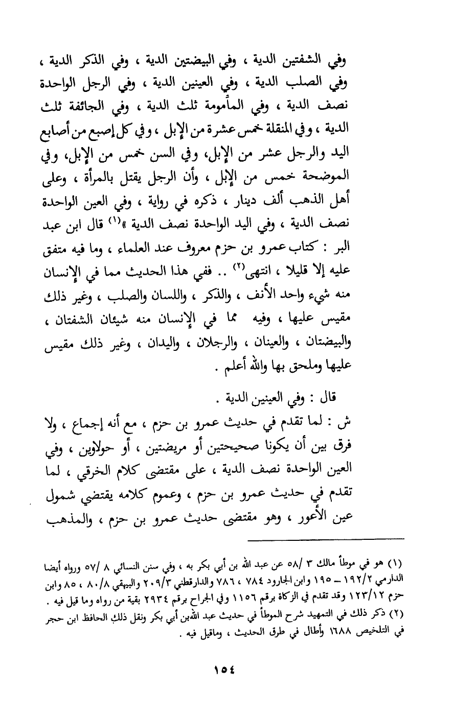 وفي الشفتين الدية، وفي البيضتين الدية، وفي الذكر الدية، وفي الصلب الدية، وفي العينين الدية، وفي الرجل الواحدة نصف الدية، وفي المأمومة ثلث الدية، وفي الجائفة ثلث الدية، وفي المنقلة خمس عشرة من الإبل، وفي كل إصبع من أصابع اليد والرجل عشر من الإبل، وفي السن خمس من الإبل، وفي الموضحة خمس من الإبل، وأن الرجل يقتل بالمرأة، وعلى أهل الذهب ألف دينار، ذكره في رواية، وفي العين الواحدة نصف الدية، وفي اليد الواحدة نصف الدية» ، قال ابن عبد البر: كتاب عمرو بن حزم معروف عند العلماء، وما فيه متفق عليه إلا قليلا، انتهى. ففي هذا الحديث مما في الإنسان منه شيء واحد الأنف، والذكر، واللسان والصلب، وغير ذلك مقيس عليها، وفيه مما في الإنسان منه شيئان الشفتان والبيضتان، والعينان، والرجلان، واليدان، وغير ذلك مقيس عليها وملحق بها والله أعلم.