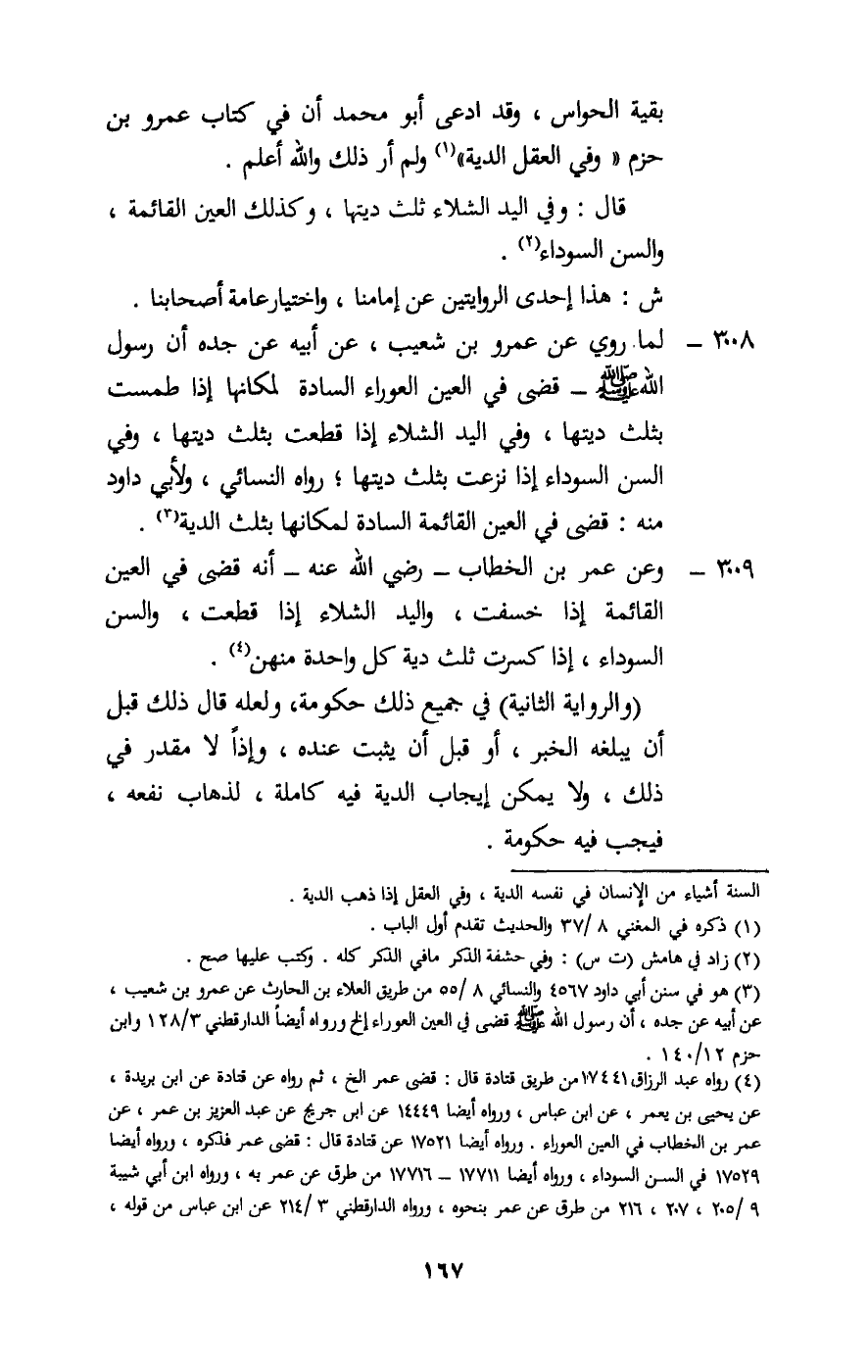 3008 - لما روي عن عمرو بن شعيب، عن أبيه عن جده «أن رسول الله - صَلَّى اللَّهُ عَلَيْهِ وَسَلَّمَ - قضى في العين العوراء السادة لمكانها إذا طمست بثلث ديتها، وفي اليد الشلاء إذا قطعت بثلث ديتها، وفي السن السوداء إذا نزعت بثلث ديتها» ؛ رواه النسائي، ولأبي داود منه: «قضى في العين القائمة السادة لمكانها بثلث الدية» .