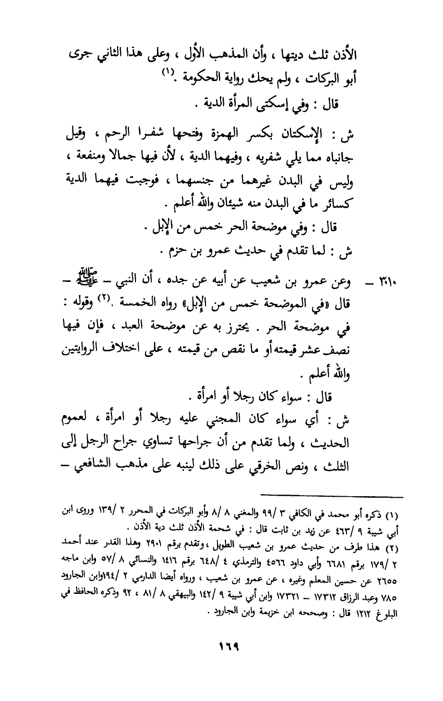 3010 - وعن عمرو بن شعيب عن أبيه عن جده، أن النبي - صَلَّى اللَّهُ عَلَيْهِ وَسَلَّمَ - قال: «في الموضحة خمس من الإبل» رواه الخمسة. وقوله: في موضحة الحر. يحترز به عن موضحة العبد، فإن فيها نصف عشر قيمته أو ما نقص من قيمته، على اختلاف الروايتين والله أعلم.