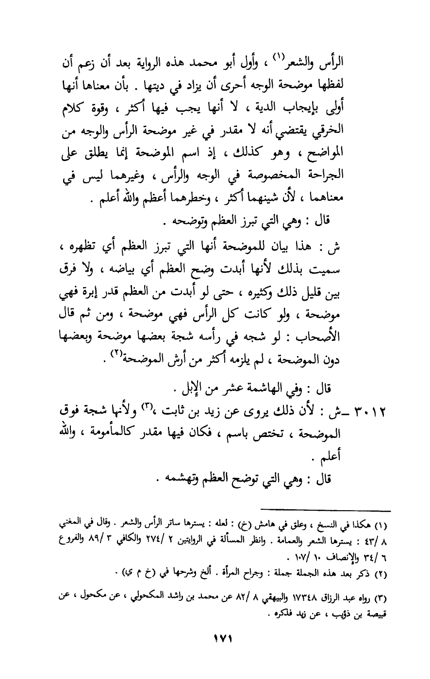 الرأس والشعر، وأول أبو محمد هذه الرواية بعد أن زعم أن لفظها موضحة الوجه أحرى أن يزاد في ديتها. بأن معناها أنها أولى بإيجاب الدية، لا أنها يجب فيها أكثر، وقوة كلام الخرقي يقتضي أنه لا مقدر في غير موضحة الرأس والوجه من المواضح، وهو كذلك، إذ اسم الموضحة إنما يطلق على الجراحة المخصوصة في الوجه والرأس، وغيرهما ليس في معناهما، لأن شينهما أكثر، وخطرهما أعظم والله أعلم.