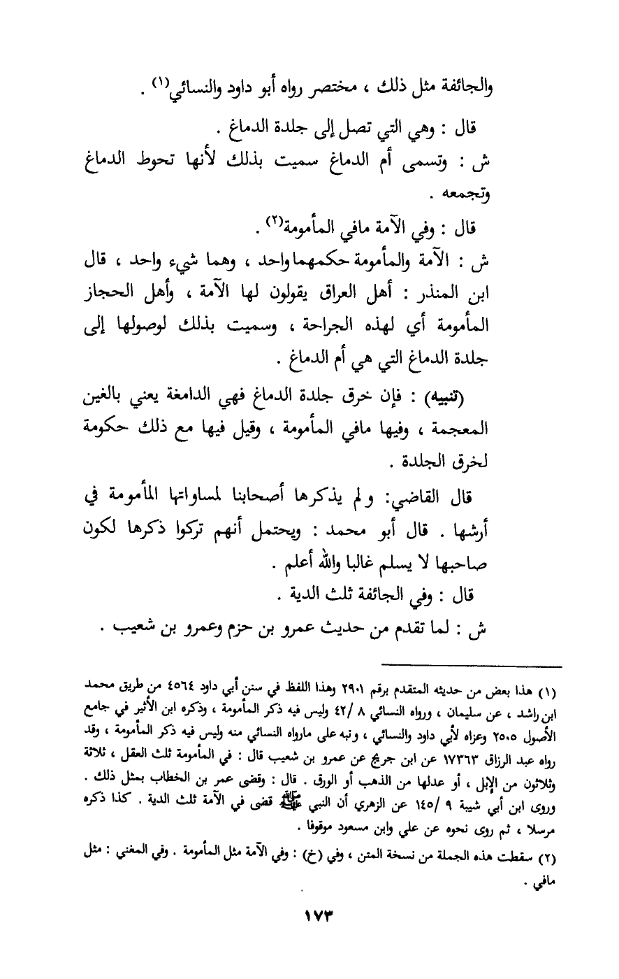 ش: الآمة والمأمومة حكمهما واحد، وهما شيء واحد، قال ابن المنذر: أهل العراق يقولون لها الآمة، وأهل الحجاز المأمومة أي لهذه الجراحة، وسميت بذلك لوصولها إلى جلدة الدماغ التي هي أم الدماغ.