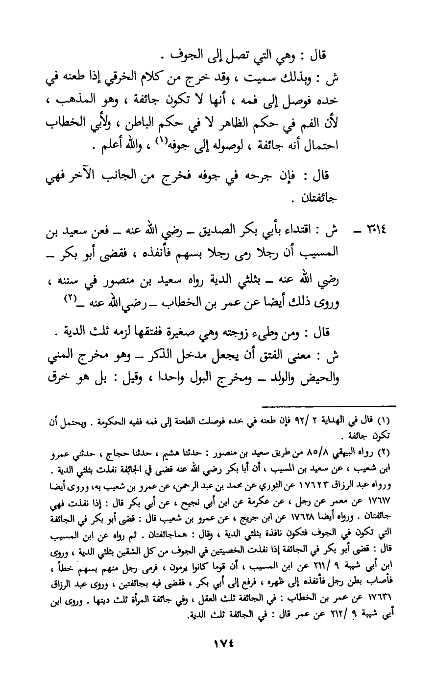 3014 - ش: اقتداء بأبي بكر الصديق - رَضِيَ اللَّهُ عَنْهُ - فعن سعيد بن المسيب أن رجلا رمى رجلا بسهم فأنفذه، فقضى أبو بكر - رَضِيَ اللَّهُ عَنْهُ - بثلثي الدية رواه سعيد بن منصور في سننه، وروى ذلك أيضا عن عمر بن الخطاب - رَضِيَ اللَّهُ عَنْهُ -.