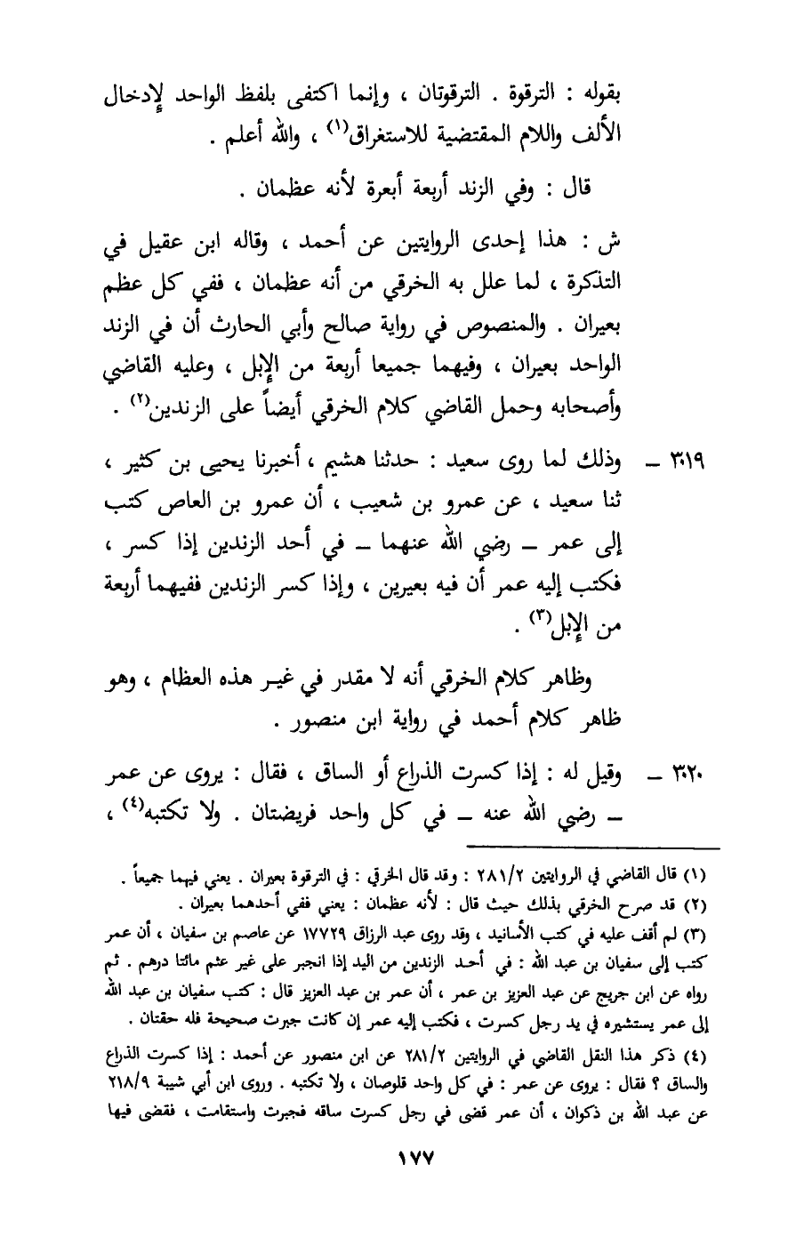 ش: هذا إحدى الروايتين عن أحمد، وقاله ابن عقيل في التذكرة، لما علل به الخرقي من أنه عظمان، ففي كل عظم بعيران. والمنصوص في رواية صالح وأبي الحارث أن في الزند الواحد بعيران، وفيهما جميعا أربعة من الإبل، وعليه القاضي وأصحابه وحمل القاضي كلام الخرقي أيضا على الزندين.