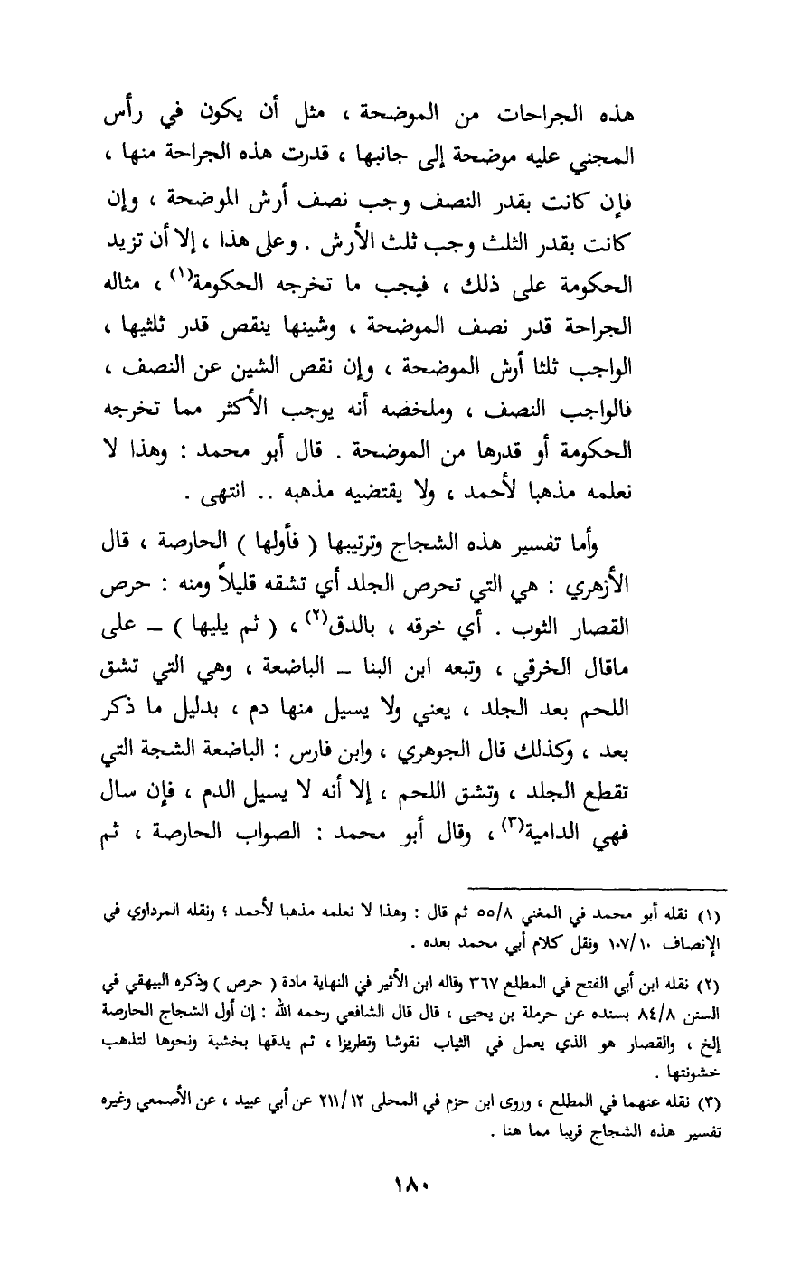هذه الجراحات من الموضحة، مثل أن يكون في رأس المجني عليه موضحة إلى جانبها، قدرت هذه الجراحة منها، فإن كانت بقدر النصف وجب نصف أرش الموضحة، وإن كانت بقدر الثلث وجب ثلث الأرش. وعلى هذا، إلا أن تزيد الحكومة على ذلك، فيجب ما تخرجه الحكومة، مثاله الجراحة قدر نصف الموضحة، وشينها ينقص قدر ثلثيها، الواجب ثلثا أرش الموضحة، وإن نقص الشين عن النصف، فالواجب النصف، وملخصه أنه يوجب الأكثر مما تخرجه الحكومة أو قدرها من الموضحة. قال أبو محمد: وهذا لا نعلمه مذهبا لأحمد، ولا يقتضيه مذهبه. . . انتهى. وأما تفسير هذه الشجاج وترتيبها (فأولها) الحارصة، قال الأزهري: هي التي تحرص الجلد أي تشقه قليلا ومنه: حرص القصار الثوب. أي خرقه، بالدق، (ثم يليها) - على ما قال الخرقي، وتبعه ابن البنا - الباضعة، وهي التي تشق اللحم بعد الجلد، يعني ولا يسيل منها دم، بدليل ما ذكر بعد، وكذلك قال الجوهري، وابن فارس: الباضعة الشجة التي تقطع الجلد، وتشق اللحم، إلا أنه لا يسيل الدم، فإن سال فهي الدامية، وقال أبو محمد: الصواب الحارصة، ثم