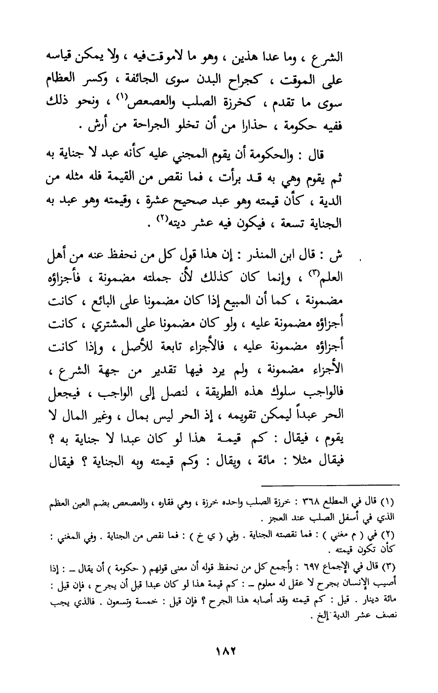ش: قال ابن المنذر: إن هذا قول كل من نحفظ عنه من أهل العلم، وإنما كان كذلك لأن جملته مضمونة، فأجزاؤه مضمونة، كما أن المبيع إذا كان مضمونا على البائع، كانت أجزاؤه مضمونة عليه، ولو كان مضمونا على المشتري كانت أجزاؤه مضمونة عليه، فالأجزاء تابعة للأصل، وإذا كانت الأجزاء مضمونة، ولم يرد فيها تقدير من جهة الشرع، فالواجب سلوك هذه الطريقة، لنصل إلى الواجب، فيجعل الحر عبدا ليمكن تقويمه، إذ الحر ليس بمال، وغير المال لا يقوم، فيقال: كم قيمة هذا لو كان عبدا لا جناية به؟ فيقال مثلا: مائة، ويقال: وكم قيمته وبه الجناية؟ فيقال