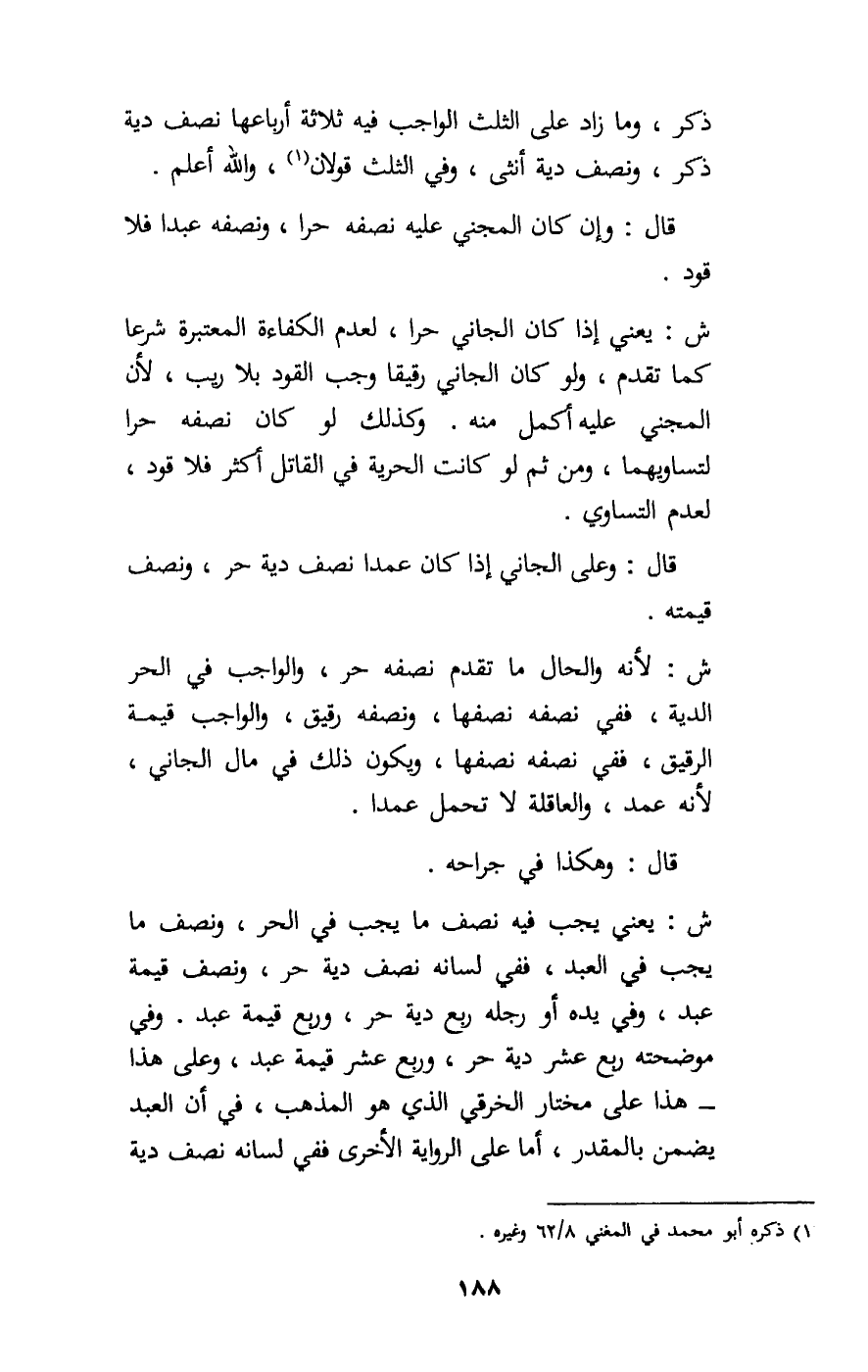 ش: يعني يجب فيه نصف ما يجب في الحر، ونصف ما يجب في العبد، ففي لسانه نصف دية حر، ونصف قيمة عبد، وفي يده أو رجله ربع دية حر، وربع قيمة عبد. وفي موضحته ربع عشر دية حر، وربع عشر قيمة عبد، وعلى هذا - هذا على مختار الخرقي الذي هو المذهب، في أن العبد يضمن بالمقدر، أما على الرواية الأخرى ففي لسانه نصف دية