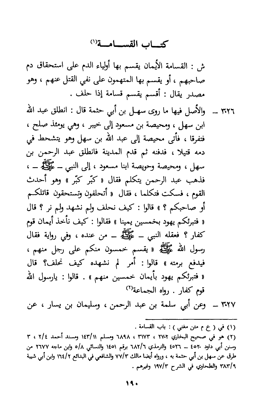 3026 - والأصل فيها ما «روى سهل بن أبي حثمة قال: انطلق عبد الله بن سهل، ومحيصة بن مسعود إلى خيبر، وهي يومئذ صلح، فتفرقا، فأتى محيصة إلى عبد الله بن سهل وهو يتشحط في دمه قتيلا، فدفنه ثم قدم المدينة فانطلق عبد الرحمن بن سهل، ومحيصة وحويصة ابنا مسعود، إلى النبي - صَلَّى اللَّهُ عَلَيْهِ وَسَلَّمَ - فذهب عبد الرحمن يتكلم فقال: «كبر كبر» وهو أحدث القوم، فسكت فتكلما، فقال: «أتحلفون وتستحقون قاتلكم أو صاحبكم» ؟ قالوا: كيف نحلف ولم نشهد ولم نر؟ قال: «فتبرئكم يهود بخمسين يمينا» فقالوا: كيف نأخذ أيمان قوم كفار؟ فعقله النبي - صَلَّى اللَّهُ عَلَيْهِ وَسَلَّمَ - من عنده» ، وفي رواية فقال رسول الله - صَلَّى اللَّهُ عَلَيْهِ وَسَلَّمَ -: «يقسم خمسون منكم على رجل منهم، فيدفع برمته» قالوا: أمر لم نشهده كيف نحلف؟ قال: «فتبرئكم يهود بأيمان خمسين منهم» . قالوا: يا رسول الله قوم كفار» . رواه الجماعة.