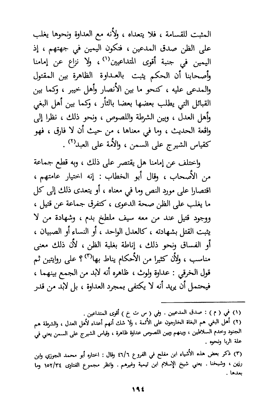 المثبت للقسامة، فلا يتعداه، ولأنه مع العداوة ونحوها يغلب على الظن صدق المدعين، فتكون اليمين في جهتهم، إذ اليمين في جنبة أقوى المتداعيين، ولا نزاع عن إمامنا وأصحابنا أن الحكم يثبت بالعداوة الظاهرة بين المقتول والمدعى عليه، كنحو ما بين الأنصار وأهل خيبر، وكما بين القبائل التي يطلب بعضها بعضا بالثأر، وكما بين أهل البغي وأهل العدل، وبين الشرطة واللصوص، ونحو ذلك، نظرا إلى واقعة الحديث، وما في معناها، من حيث أن لا فارق، فهو كقياس الشيرج على السمن، والأمة على العبد. واختلف عن إمامنا هل يقتصر على ذلك، وبه قطع جماعة من الأصحاب، وقال أبو الخطاب: إنه اختيار عامتهم، اقتصارا على مورد النص وما في معناه، أو يتعدى ذلك إلى كل ما يغلب على الظن صحة الدعوى، كتفرق جماعة عن قتيل، ووجود قتيل عند من معه سيف ملطخ بدم، وشهادة من لا يثبت القتل بشهادته، كالعدل الواحد، أو النساء أو الصبيان، أو الفساق ونحو ذلك، إناطة بغلبة الظن، لأن ذلك معنى مناسب، ولأن كثيرا من الأحكام يناط بها؟ على روايتين ثم قول الخرقي: عداوة ولوث، ظاهره أنه لا بد من الجمع بينهما، فيحتمل أن يريد أنه لا يكتفى بمجرد العداوة، بل لا بد من قدر