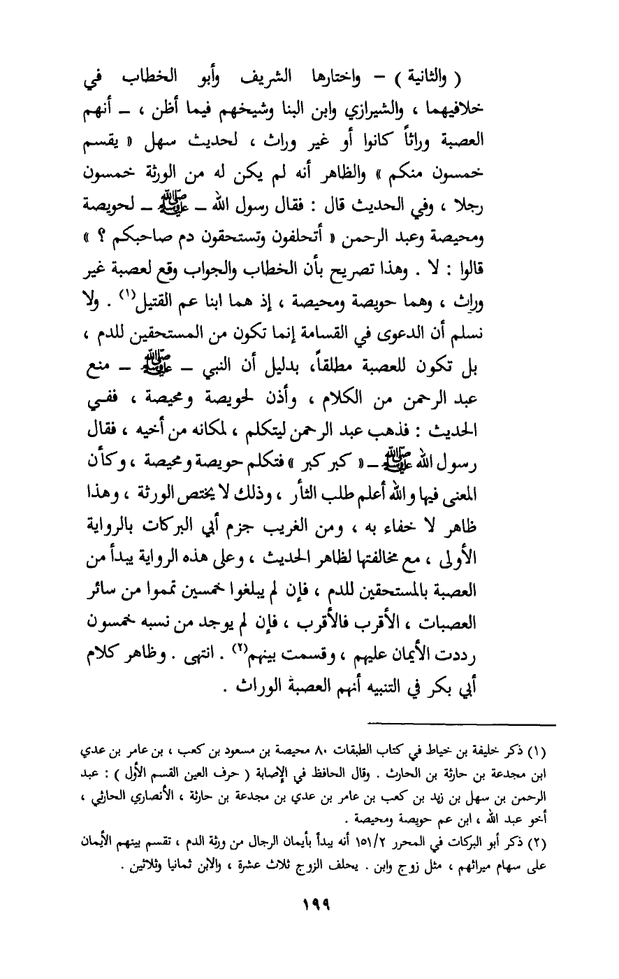 (والثانية) : واختارها الشريف وأبو الخطاب في خلافيهما، والشيرازي وابن البنا وشيخهم فيما أظن، أنهم العصبة وراثا كانوا أو غير وراث، لحديث سهل: «يقسم خمسون منكم» ، والظاهر أنه لم يكن له من الورثة خمسون رجلا، وفي الحديث قال: «فقال رسول الله - صَلَّى اللَّهُ عَلَيْهِ وَسَلَّمَ - لحويصة ومحيصة وعبد الرحمن؛ «أتحلفون وتستحقون دم صاحبكم؟» قالوا: لا.» وهذا تصريح بأن الخطاب والجواب وقع لعصبة غير وراث، وهما حويصة ومحيصة، إذ هما ابنا عم القتيل. ولا نسلم أن الدعوى في القسامة إنما تكون من المستحقين للدم، بل تكون للعصبة مطلقا، بدليل أن النبي - صَلَّى اللَّهُ عَلَيْهِ وَسَلَّمَ - منع عبد الرحمن من الكلام، وأذن لحويصة ومحيصة، ففي الحديث: فذهب عبد الرحمن ليتكلم، لمكانه من أخيه، فقال رسول الله - صَلَّى اللَّهُ عَلَيْهِ وَسَلَّمَ -: «كبر كبر» ، فتكلم حويصة ومحيصة، وكأن المعنى فيها والله أعلم طلب الثأر، وذلك لا يختص الورثة، وهذا ظاهر لا خفاء به، ومن الغريب جزم أبي البركات بالرواية الأولى، مع مخالفتها لظاهر الحديث، وعلى هذه الرواية يبدأ من العصبة بالمستحقين للدم، فإن لم يبلغوا خمسين تمموا من سائر العصبات، الأقرب فالأقرب، فإن لم يوجد من نسبه خمسون رددت الأيمان عليهم، وقسمت بينهم، انتهى. وظاهر كلام أبي بكر في التنبيه أنهم العصبة الوراث.
