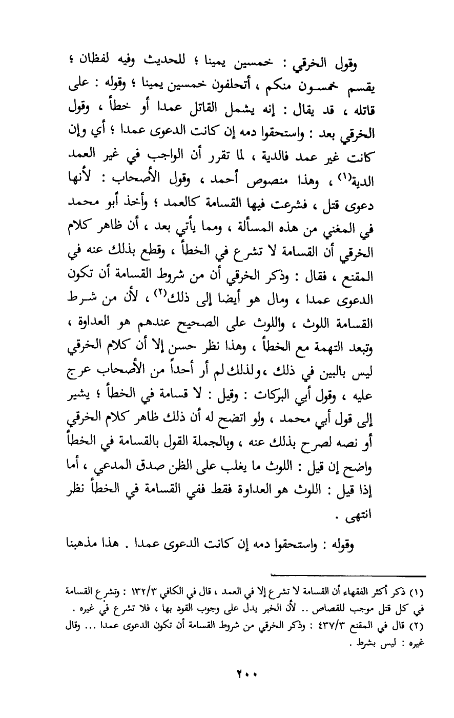 وقول الخرقي: خمسين يمينا؛ للحديث وفيه لفظان، يقسم خمسون منكم، أتحلفون خمسين يمينا؛ وقوله: على قاتله، قد يقال: إنه يشمل القاتل عمدا أو خطأ، وقول الخرقي بعد: واستحقوا دمه إن كانت الدعوى عمدا؛ أي وإن كانت غير عمد فالدية، لما تقرر أن الواجب في غير العمد الدية، وهذا منصوص أحمد، وقول الأصحاب: لأنها دعوى قتل، فشرعت فيها القسامة كالعمد، وأخذ أبو محمد في المغني من هذه المسألة، ومما يأتي بعد، أن ظاهر كلام الخرقي أن القسامة لا تشرع في الخطأ، وقطع بذلك عنه في المقنع، فقال: وذكر الخرقي أن من شروط القسامة أن تكون الدعوى عمدا، ومال هو أيضا إلى ذلك، لأن من شرط القسامة اللوث، واللوث على الصحيح عندهم هو العداوة، وتبعد التهمة مع الخطأ، وهذا نظر حسن إلا أن كلام الخرقي ليس بالبين في ذلك، ولذلك لم أر أحدا من الأصحاب عرج عليه، وقول أبي البركات، وقيل: لا قسامة في الخطأ؛ يشير إلى قول أبي محمد، ولو اتضح له أن ذلك ظاهر كلام الخرقي أو نصه لصرح بذلك عنه، وبالجملة القول بالقسامة في الخطأ واضح إن قيل: اللوث ما يغلب على الظن صدق المدعي، أما إذا قيل: اللوث هو العداوة فقط ففي القسامة في الخطأ نظر انتهى. وقوله: واستحقوا دمه إن كانت الدعوى عمدا. هذا مذهبنا