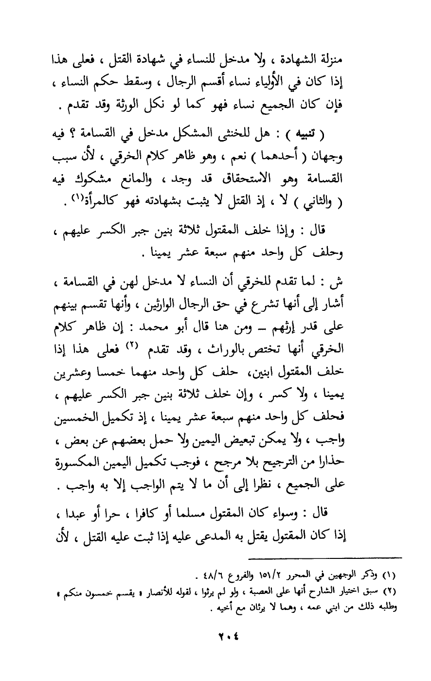 (تنبيه) : هل للخنثى المشكل مدخل في القسامة؟ فيه وجهان (أحدهما) نعم، وهو ظاهر كلام الخرقي، لأن سبب القسامة وهو الاستحقاق قد وجد، والمانع مشكوك فيه.