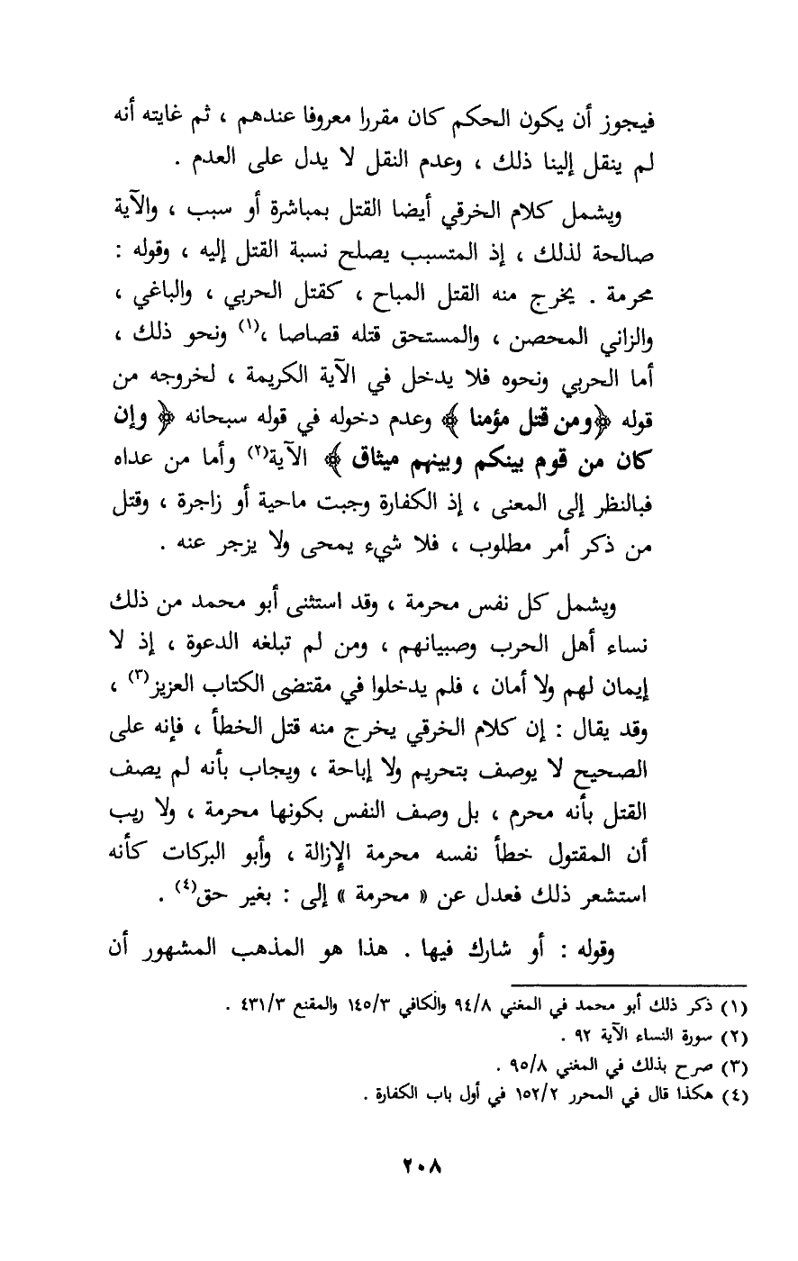 فيجوز أن يكون الحكم كان مقررا معروفا عندهم، ثم غايته أنه لم ينقل إلينا ذلك، وعدم النقل لا يدل على العدم. ويشمل كلام الخرقي أيضا القتل بمباشرة أو سبب، والآية صالحة لذلك، إذ المتسبب يصلح نسبة القتل إليه، وقوله: محرمة، يخرج منه القتل المباح، كقتل الحربي، والباغي، والزاني المحصن، والمستحق قتله قصاصا، ونحو ذلك، أما الحربي ونحوه فلا يدخل في الآية الكريمة، لخروجه من قوله: {وَمَنْ قَتَلَ مُؤْمِنًا} [النساء: 92] وعدم دخوله في قوله سبحانه: {وَإِنْ كَانَ مِنْ قَوْمٍ بَيْنَكُمْ وَبَيْنَهُمْ مِيثَاقٌ} [النساء: 92] الآية، وأما من عداه فبالنظر إلى المعنى، إذ الكفارة وجبت ماحية أو زاجرة، وقتل من ذكر أمر مطلوب، فلا شيء يمحى ولا يزجر عنه. ويشمل كل نفس محرمة، وقد استثنى أبو محمد من ذلك نساء أهل الحرب وصبيانهم، ومن لم تبلغه الدعوة، إذ لا إيمان لهم ولا أمان، فلم يدخلوا في مقتضى الكتاب العزيز، وقد يقال: إن كلام الخرقي يخرج منه قتل الخطأ، فإنه على الصحيح لا يوصف بتحريم ولا إباحة، ويجاب بأنه لم يصف القتل بأنه محرم، بل وصف النفس بكونها محرمة، ولا ريب أن المقتول خطأ نفسه محرمة الإزالة، وأبو البركات كأنه استشعر ذلك فعدل عن «محرمة» إلى: بغير حق.