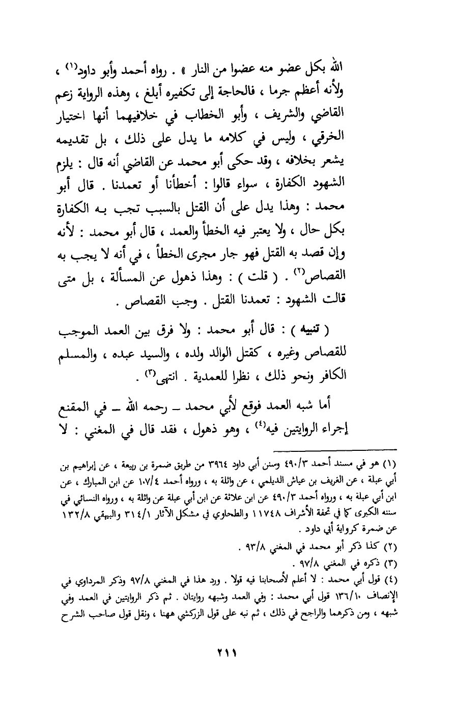 الله بكل عضو منه عضوا من النار» رواه أحمد وأبو داود، ولأنه أعظم جرما، فالحاجة إلى تكفيره أبلغ، وهذه الرواية زعم القاضي والشريف، وأبو الخطاب في خلافيهما أنها اختيار الخرقي، وليس في كلامه ما يدل على ذلك، بل تقديمه يشعر بخلافه، وقد حكى أبو محمد عن القاضي أنه قال: يلزم الشهود والكفارة، سواء قالوا: أخطأنا أو تعمدنا. قال أبو محمد: وهذا يدل على أن القتل بالسبب تجب به الكفارة بكل حال، ولا يعتبر فيه الخطأ والعمد، قال أبو محمد: لأنه وإن قصد به القتل فهو جار مجرى الخطأ، في أنه لا يجب به القصاص. (قلت) : وهذا ذهول عن المسألة، بل متى قالت الشهود: تعمدنا القتل، وجب القصاص.