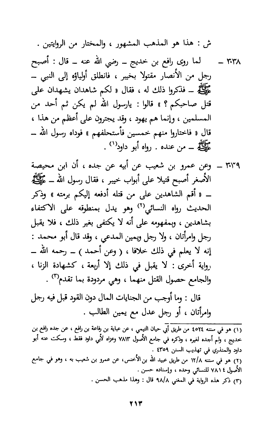 3039 - وعن عمرو بن شعيب عن أبيه عن جده، «أن ابن محيصة الأصغر أصبح قتيلا على أبواب خيبر، فقال رسول الله - صَلَّى اللَّهُ عَلَيْهِ وَسَلَّمَ -: «أقم الشاهدين على من قتله أدفعه إليكم برمته» وذكر الحديث رواه النسائي وهو يدل بمنطوقه على الاكتفاء بشاهدين، وبمفهومه على أنه لا يكتفى بغير ذلك، فلا يقبل رجل وامرأتان، ولا رجل ويمين المدعي، وقد قال أبو محمد: إنه لا يعلم في ذلك خلافا، (وعن أحمد) - رَحِمَهُ اللَّهُ - رواية أخرى: لا يقبل في ذلك إلا أربعة، كشهادة الزنا، والجامع حصول القتل منهما، وهي مردودة بما تقدم.