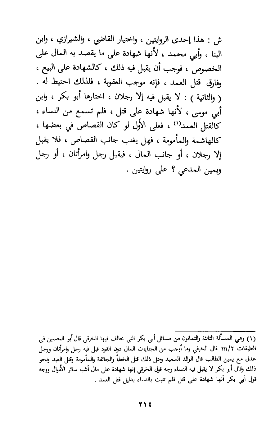 (والثانية) : لا يقبل فيه إلا رجلان، اختارها أبو بكر، وابن أبي موسى، لأنها شهادة على قتل، فلم تسمع من النساء، كالقتل العمد، فعلى الأول لو كان القصاص في بعضها، كالهاشمة والمأمومة، فهل يغلب جانب القصاص، فلا يقبل إلا رجلان، أو جانب المال، فيقبل رجل وامرأتان، أو رجل ويمين المدعي؟ على روايتين.