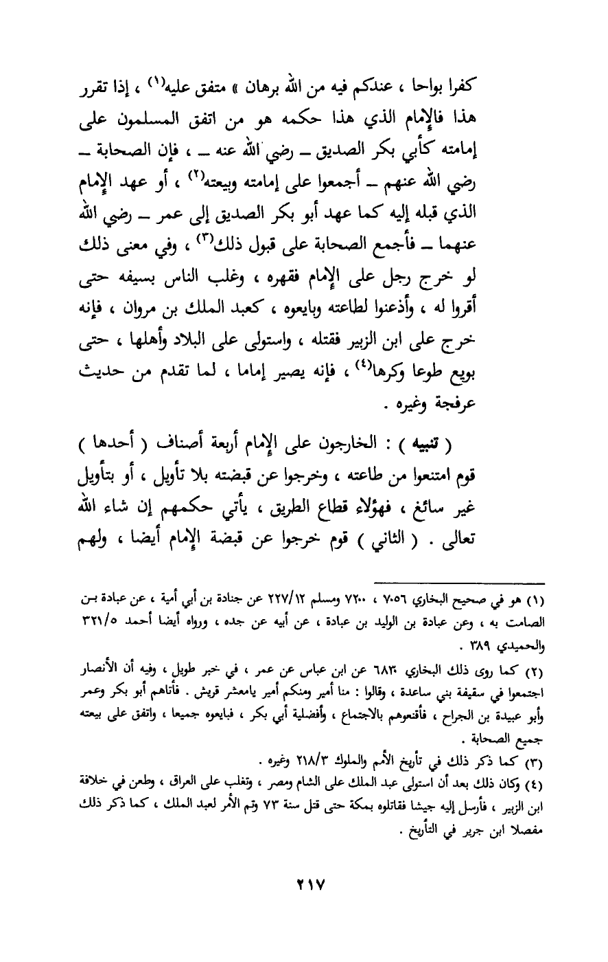 كفرا بواحا، عندكم فيه من الله برهان» متفق عليه، إذ تقرر هذا فالإمام الذي هذا حكمه هو من اتفق المسلمون على إمامته كأبي بكر الصديق - رَضِيَ اللَّهُ عَنْهُ -، فإن الصحابة - رَضِيَ اللَّهُ عَنْهُمْ - أجمعوا على إمامته وبيعته، أو عهد الإمام الذي قبله إليه كما عهد أبو بكر الصديق إلى عمر - رَضِيَ اللَّهُ عَنْهُمَا - فأجمع الصحابة على قبول ذلك، وفي معنى ذلك لو خرج رجل على الإمام فقهره، وغلب الناس بسيفه حتى أقروا له، وأذعنوا لطاعته وبايعوه، كعبد الملك بن مروان، فإنه حرج على ابن الزبير فقتله، واستولى على البلاد وأهلها، حتى بويع طوعا وكرها، فإنه يصير إماما، لما تقدم من حديث عرفجة وغيره.