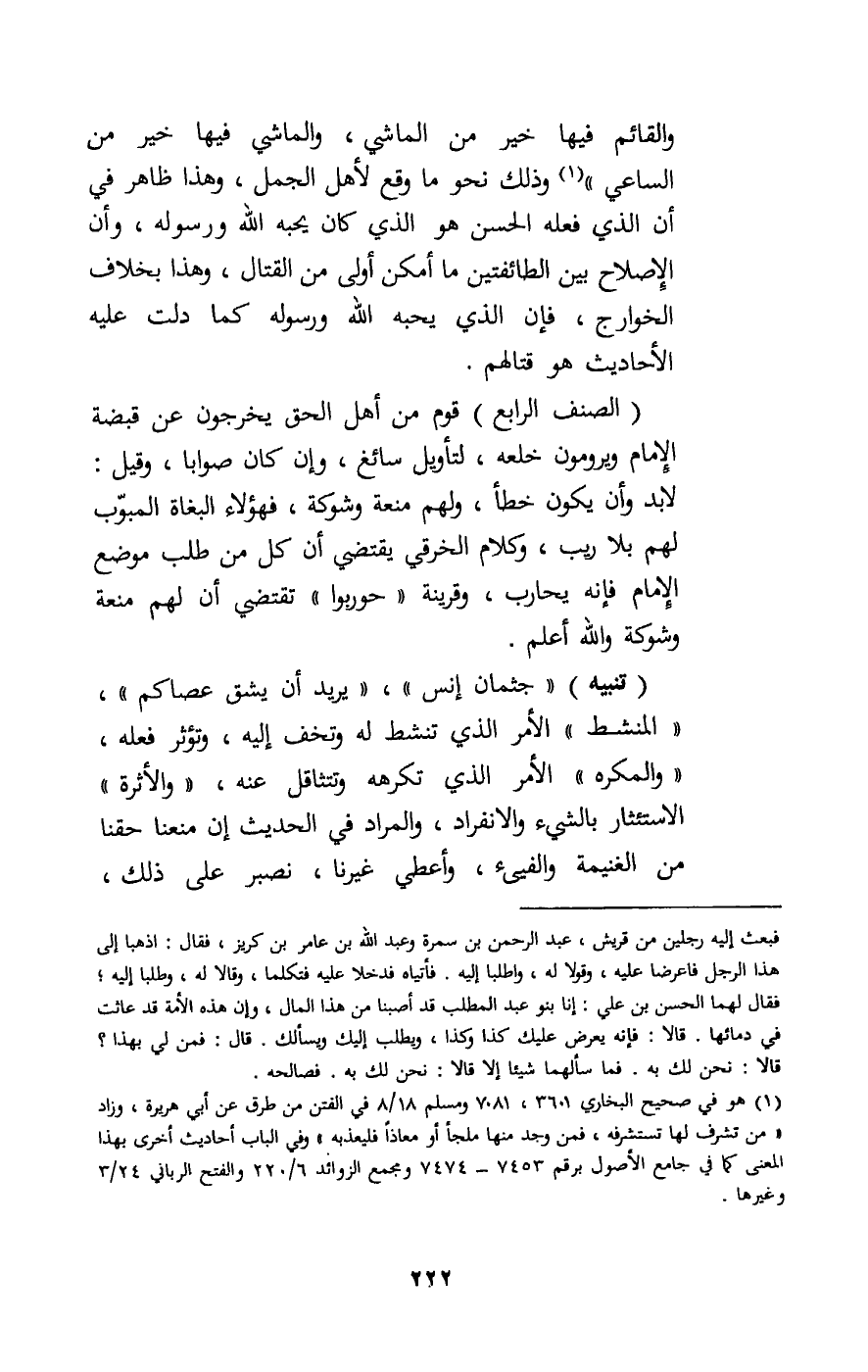 والقائم فيها خير من الماشي، والماشي فيها خير من الساعي» وذلك نحو ما وقع لأهل الجمل، وهذا ظاهر في أن الذي فعله الحسن هو الذي كان يحبه الله ورسوله، وأن الإصلاح بين الطائفتين ما أمكن أولى من القتال، وهذا بخلاف الخوارج، فإن الذي يحبه الله ورسوله كما دلت عليه الأحاديث هو قتالهم.