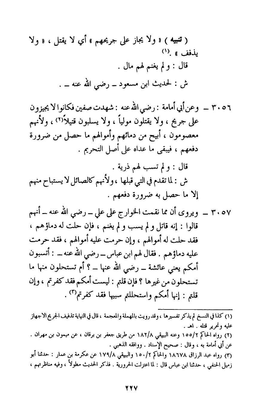 3057 - ويروى أن مما نقمت الخوارج على علي - رَضِيَ اللَّهُ عَنْهُ - أنهم قالوا: إنه قاتل ولم يسب ولم يغنم، فإن حلت له دماؤهم، فقد حلت له أموالهم، وإن حرمت عليه أموالهم، فقد حرمت عليه دماؤهم. فقال لهم ابن عباس - رَضِيَ اللَّهُ عَنْهُ -: أتسبون أمكم يعني عائشة - رَضِيَ اللَّهُ عَنْهَا -؟ أم تستحلون منها ما تستحلون من غيرها؟ فإن قلتم: ليست أمكم فقد كفرتم، وإن قلتم: إنها أمكم واستحللتم سبيها فقد كفرتم.