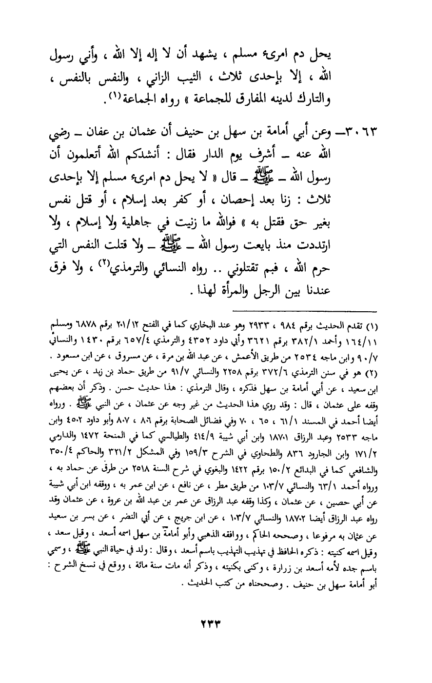 3063 - وعن أبي أمامة بن سهل بن حنيف «أن عثمان بن عفان - رَضِيَ اللَّهُ عَنْهُ - أشرف يوم الدار، فقال: أنشدكم الله أتعلمون أن رسول الله - صَلَّى اللَّهُ عَلَيْهِ وَسَلَّمَ - قال: «لا يحل دم امرئ مسلم إلا بإحدى ثلاث: زنا بعد إحصان، أو كفر بعد إسلام، أو قتل نفس بغير حق فقتل به» ، فوالله ما زنيت في جاهلية ولا إسلام، ولا ارتددت منذ بايعت رسول الله - صَلَّى اللَّهُ عَلَيْهِ وَسَلَّمَ - ولا قتلت النفس التي حرم الله، فبم تقتلوني» . . . رواه النسائي والترمذي، ولا فرق عندنا بين الرجل والمرأة لهذا.