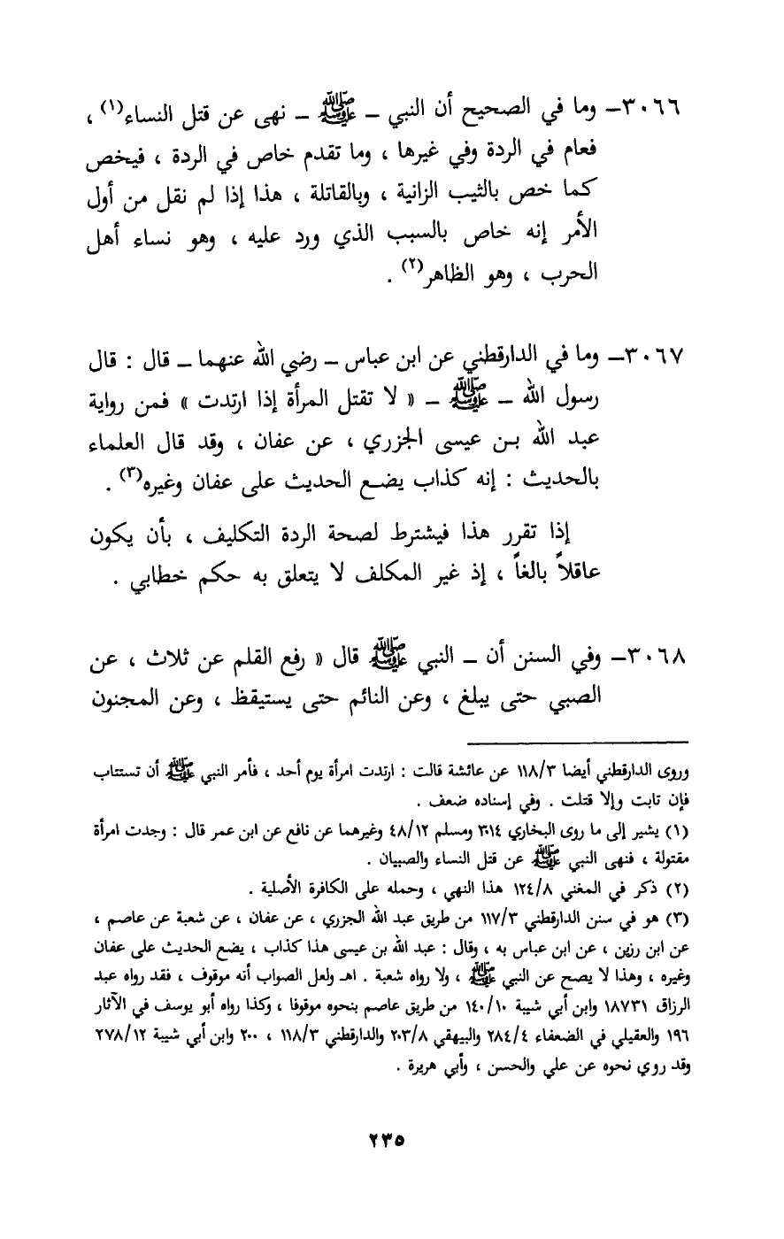 3068 - وفي السنن أن النبي - صَلَّى اللَّهُ عَلَيْهِ وَسَلَّمَ - قال: «رفع القلم عن ثلاث، عن الصبي حتى يبلغ، وعن النائم حتى يستيقظ، وعن المجنون