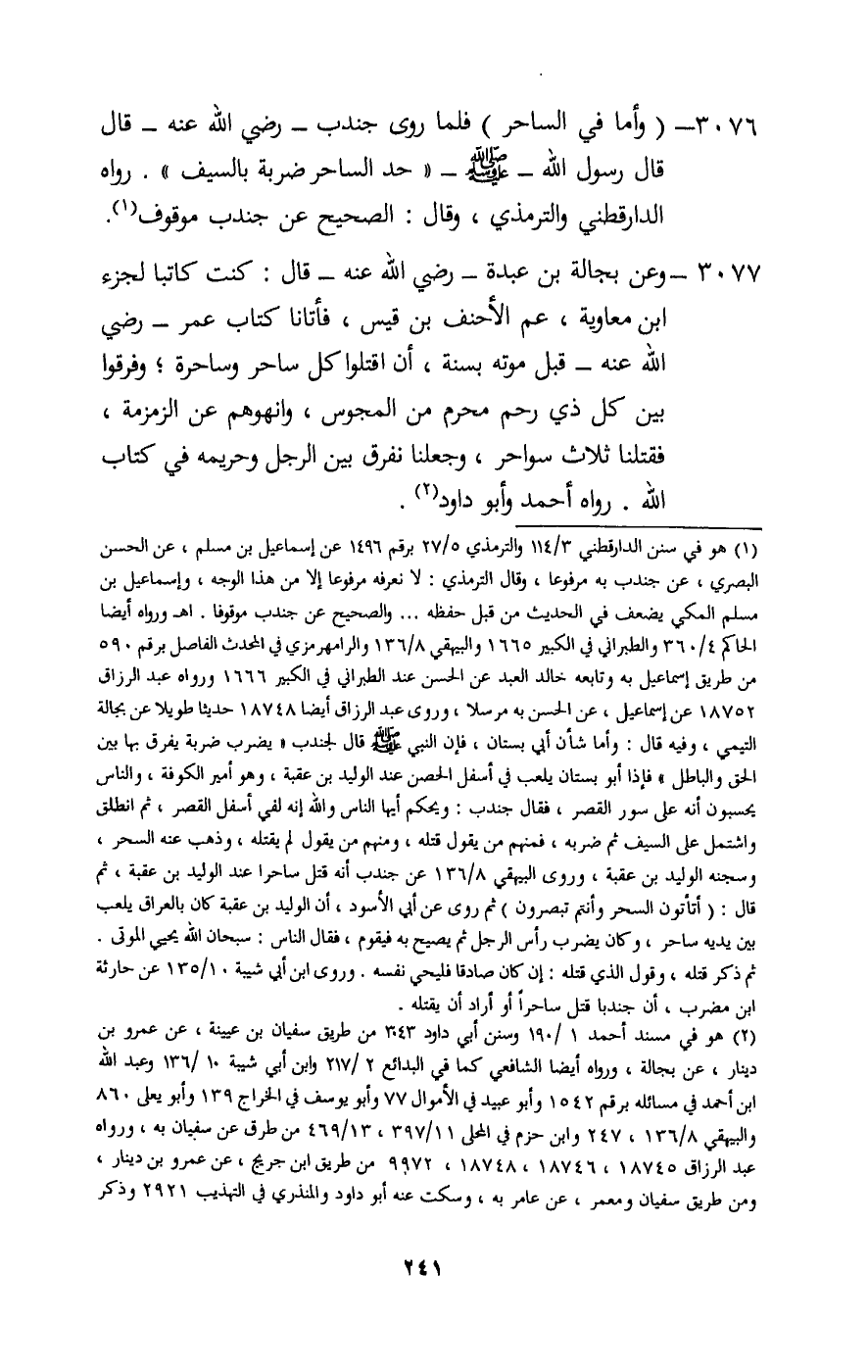 3077 - وعن بجالة بن عبدة - رَضِيَ اللَّهُ عَنْهُ - قال كنت كاتبا لجزء بن معاوية عم الأحنف بن قيس فأتانا كتاب عمر - رَضِيَ اللَّهُ عَنْهُ - قبل موته بسنة أن اقتلوا كل ساحر وساحرة وفرقوا بين كل ذي رحم محرم من المجوس، وانهوهم عن الزمزمة، فقتلنا ثلاث سواحر، وجعلنا نفرق بين الرجل وحريمه في كتاب الله. رواه أحمد وأبو داود.